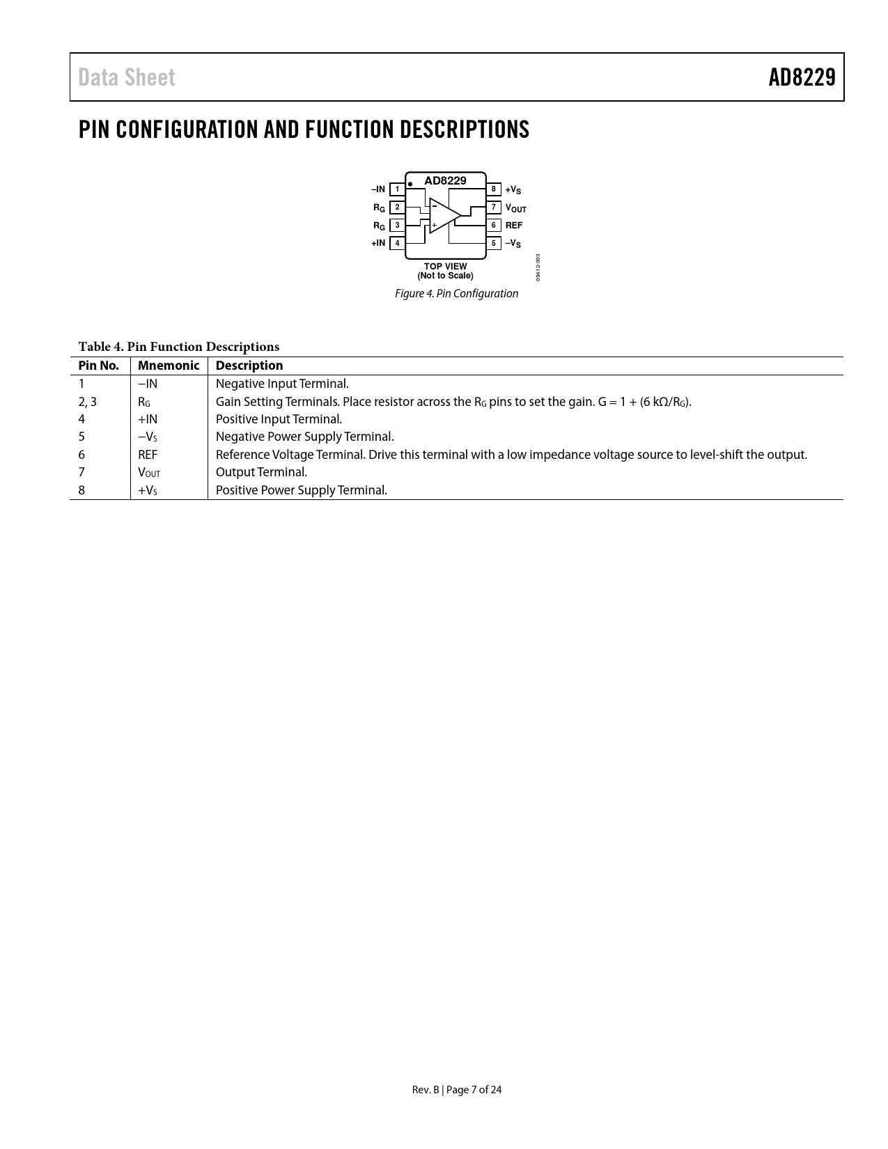 Data Sheet AD8229 PIN CONFIGURATION AND FUNCTION DESCRIPTIONS AD8229 –IN 1 8 +VS RG 2 7 VOUT RG 3 6 REF +IN 4 5 –VS