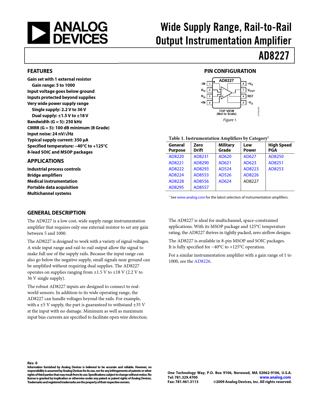 Wide Supply Range, Rail-to-Rail. Output Instrumentation Amplifier. AD8227. FEATURES. PIN CONFIGURATION