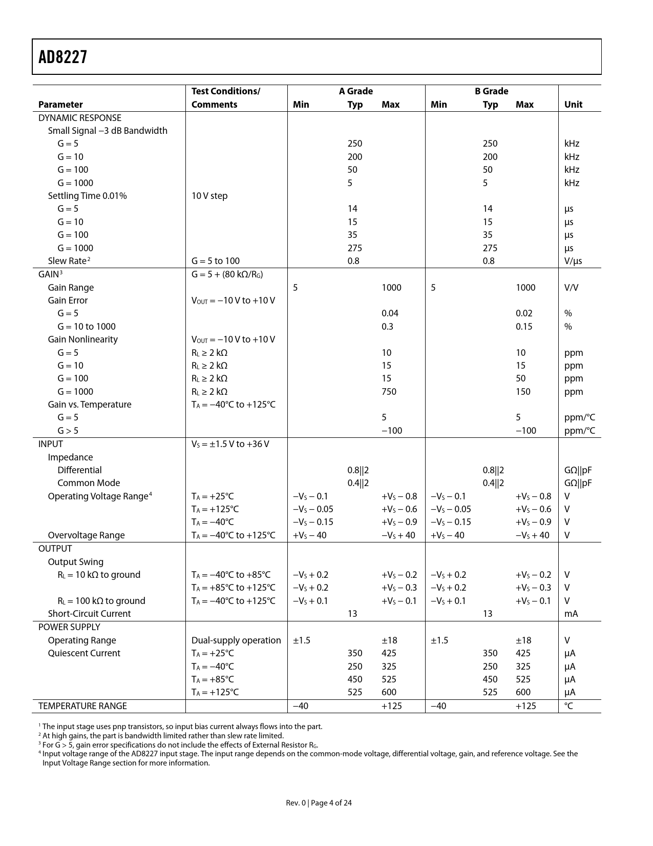 AD8227 Test Conditions/ A Grade B Grade Parameter Comments Min Typ Max Min Typ Max Unit