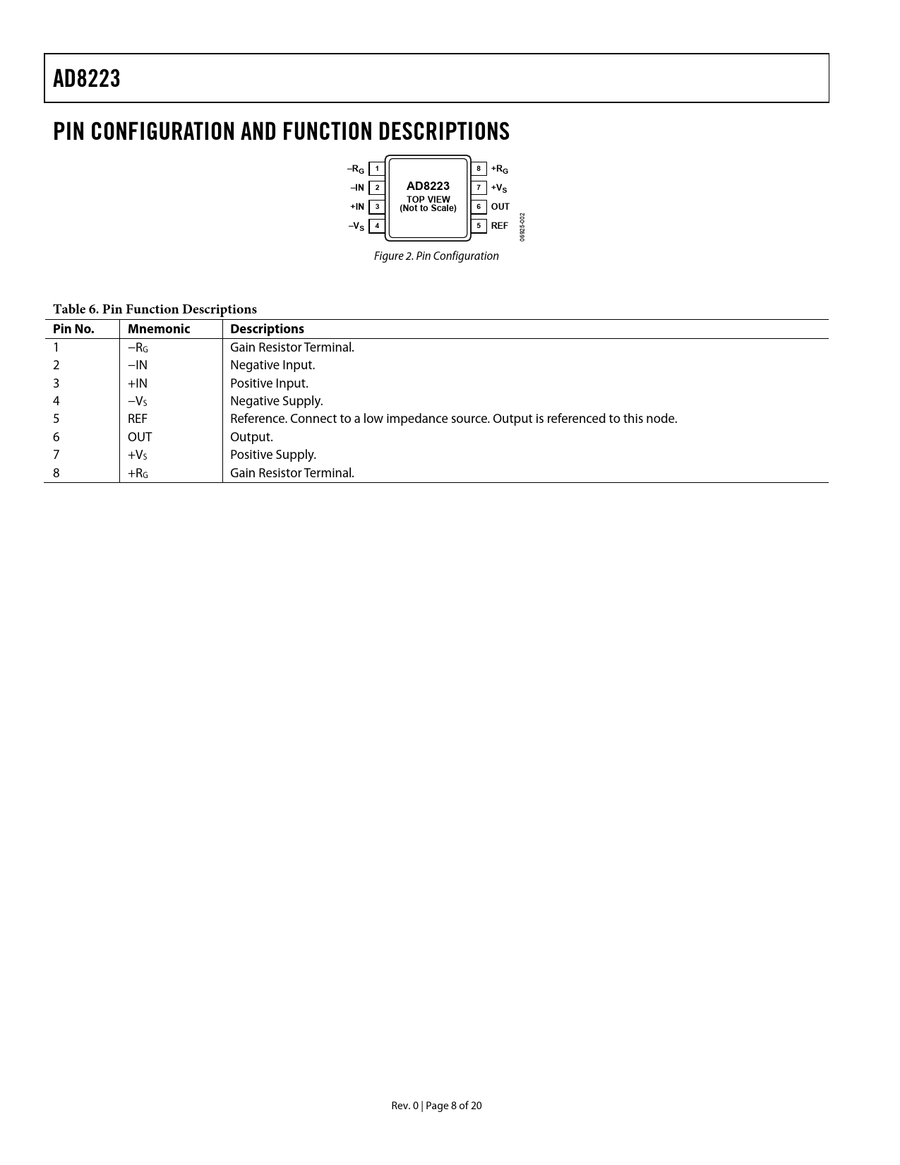 AD8223 PIN CONFIGURATION AND FUNCTION DESCRIPTIONS –RG 1 8 +RG –IN 2 AD8223 7 +VS TOP VIEW +IN 3 6 (Not to Scale) OUT