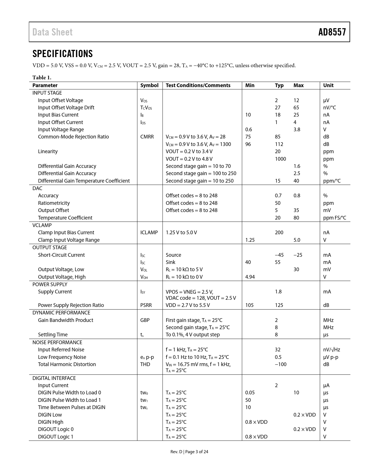Data Sheet. AD8557. SPECIFICATIONS. Table 1. Parameter. Symbol. Test Conditions/Comments. Min. Typ. Max. Unit