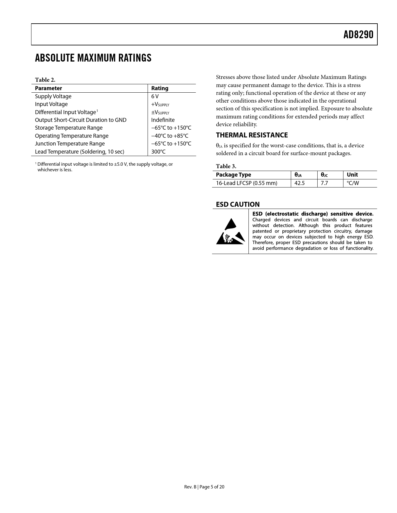 link to page 6 AD8290ABSOLUTE MAXIMUM RATINGSTable 2. Stresses above those listed under Absolute Maximum Ratings may cause permanent damage to the device. This is a stress Parameter Rating rating only; functional operation of the device at these or any Supply Voltage 6 V other conditions above those indicated in the operational Input Voltage +VSUPPLY section of this specification is not implied. Exposure to absolute Differential Input Voltage1 ±VSUPPLY maximum rating conditions for extended periods may affect Output Short-Circuit Duration to GND Indefinite device reliability. Storage Temperature Range −65°C to +150°C Operating Temperature Range −40°C to +85°C THERMAL RESISTANCE Junction Temperature Range −65°C to +150°C θJA is specified for the worst-case conditions, that is, a device Lead Temperature (Soldering, 10 sec) 300°C soldered in a circuit board for surface-mount packages. 1 Differential input voltage is limited to ±5.0 V, the supply voltage, or Table 3. whichever is less. Package TypeθJAθJCUnit 16-Lead LFCSP (0.55 mm) 42.5 7.7 °C/W ESD CAUTION Rev. B | Page 5 of 20 Document Outline FEATURES APPLICATIONS GENERAL DESCRIPTION FUNCTIONAL BLOCK DIAGRAM TABLE OF CONTENTS REVISION HISTORY SPECIFICATIONS ABSOLUTE MAXIMUM RATINGS THERMAL RESISTANCE ESD CAUTION PIN CONFIGURATION AND FUNCTION DESCRIPTIONS TYPICAL PERFORMANCE CHARACTERISTICS THEORY OF OPERATION AMPLIFIER HIGH POWER SUPPLY REJECTION (PSR) AND COMMON-MODE REJECTION (CMR) 1/f NOISE CORRECTION CURRENT SOURCE APPLICATIONS INFORMATION TYPICAL CONNECTIONS CURRENT EXCITATION ENABLE/DISABLE FUNCTION OUTPUT FILTERING CLOCK FEEDTHROUGH MAXIMIZING PERFORMANCE THROUGH PROPER LAYOUT POWER SUPPLY BYPASSING DUAL-SUPPLY OPERATION PRESSURE SENSOR BRIDGE APPLICATION TEMPERATURE SENSOR APPLICATION ADC/MICROCONTROLLER OUTLINE DIMENSIONS ORDERING GUIDE