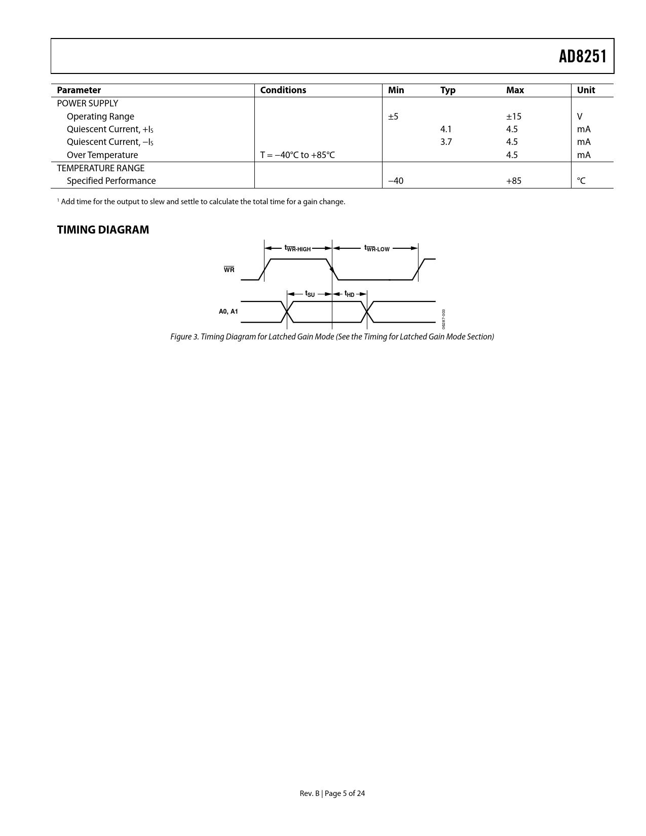 Páginas / Página25 / 6 — AD8251. Parameter. Conditions. Min. Typ. Max. Unit. TIMING DIAGRAM. …