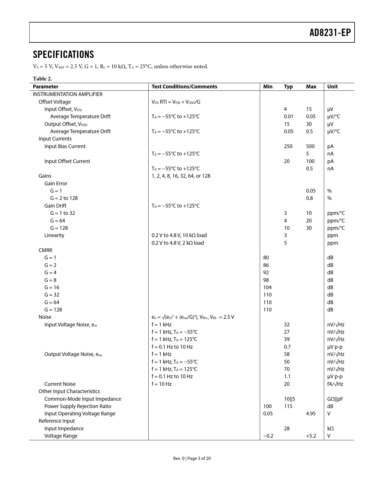 AD8231-EPSPECIFICATIONS VS = 5 V, VREF = 2.5 V, G = 1, RL = 10 kΩ, TA = 25°C, unless otherwise noted. Table 2. Parameter TestConditions/CommentsMinTypMaxUnit INSTRUMENTATION AMPLIFIER Offset Voltage VOS RTI = VOSI + VOSO/G Input Offset, VOSI 4 15 μV Average Temperature Drift TA = −55°C to +125°C 0.01 0.05 μV/°C Output Offset, VOSO 15 30 μV Average Temperature Drift TA = −55°C to +125°C 0.05 0.5 μV/°C Input Currents Input Bias Current 250 500 pA TA = −55°C to +125°C 5 nA Input Offset Current 20 100 pA TA = −55°C to +125°C 0.5 nA Gains 1, 2, 4, 8, 16, 32, 64, or 128 Gain Error G = 1 0.05 % G = 2 to 128 0.8 % Gain Drift TA = −55°C to +125°C G = 1 to 32 3 10 ppm/°C G = 64 4 20 ppm/°C G = 128 10 30 ppm/°C Linearity 0.2 V to 4.8 V, 10 kΩ load 3 ppm 0.2 V to 4.8 V, 2 kΩ load 5 ppm CMRR G = 1 80 dB G = 2 86 dB G = 4 92 dB G = 8 98 dB G = 16 104 dB G = 32 110 dB G = 64 110 dB G = 128 110 dB Noise e 2 n = √(eni + (eno/G)2), VIN+, VIN− = 2.5 V Input Voltage Noise, eni f = 1 kHz 32 nV/√Hz f = 1 kHz, TA = −55°C 27 nV/√Hz f = 1 kHz, TA = 125°C 39 nV/√Hz f = 0.1 Hz to 10 Hz 0.7 μV p-p Output Voltage Noise, eno f = 1 kHz 58 nV/√Hz f = 1 kHz, TA = −55°C 50 nV/√Hz f = 1 kHz, TA = 125°C 70 nV/√Hz f = 0.1 Hz to 10 Hz 1.1 μV p-p Current Noise f = 10 Hz 20 fA/√Hz Other Input Characteristics Common-Mode Input Impedance 10||5 GΩ||pF Power Supply Rejection Ratio 100 115 dB Input Operating Voltage Range 0.05 4.95 V Reference Input Input Impedance 28 kΩ Voltage Range −0.2 +5.2 V Rev. 0 | Page 3 of 20 Document Outline FEATURES ENHANCED PRODUCT FEATURES FUNCTIONAL BLOCK DIAGRAM GENERAL DESCRIPTION TABLE OF CONTENTS REVISION HISTORY SPECIFICATIONS ABSOLUTE MAXIMUM RATINGS THERMAL RESISTANCE MAXIMUM POWER DISSIPATION ESD CAUTION PIN CONFIGURATION AND FUNCTION DESCRIPTIONS TYPICAL PERFORMANCE CHARACTERISTICS INSTRUMENTATION AMPLIFIER PERFORMANCE CURVES OPERATIONAL AMPLIFIER PERFORMANCE CURVES PERFORMANCE CURVES VALID FOR BOTH AMPLIFIERS OUTLINE DIMENSIONS ORDERING GUIDE