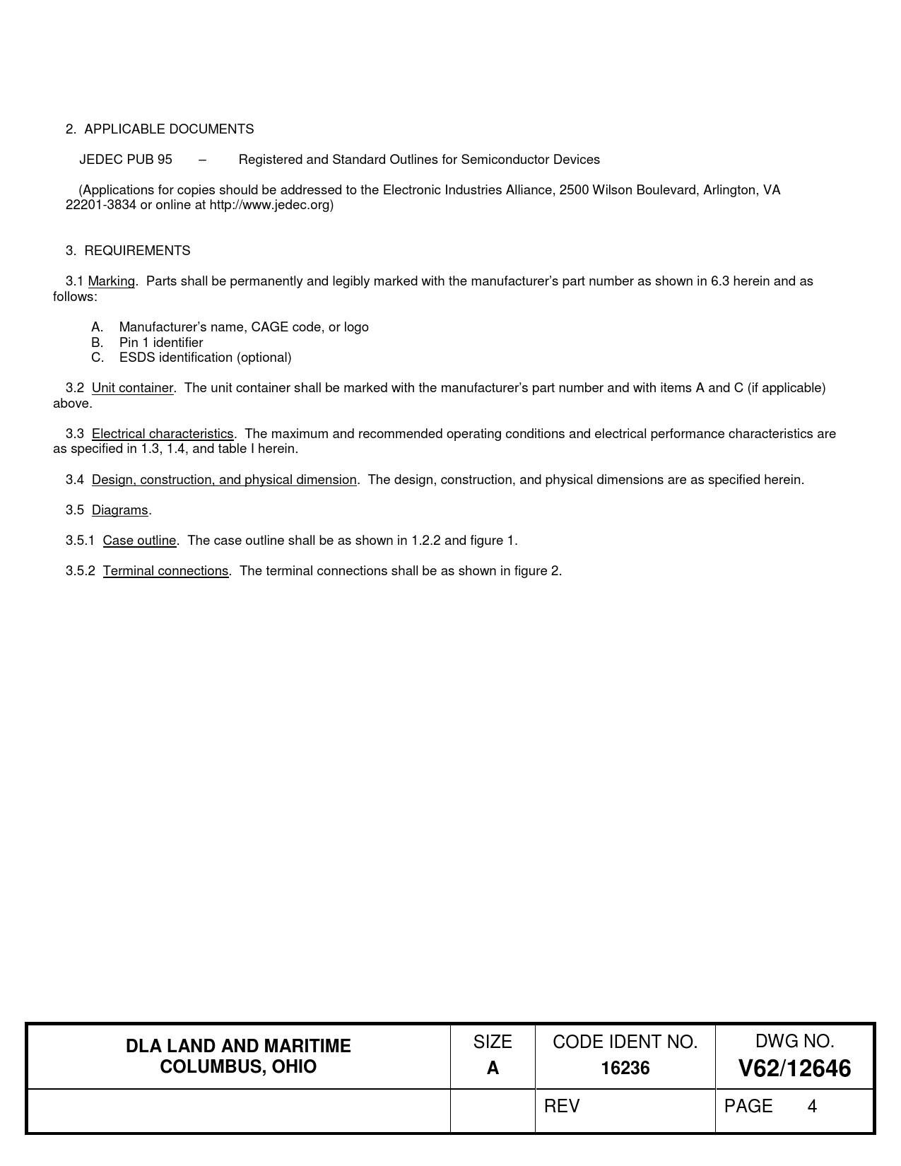 2. APPLICABLE DOCUMENTS JEDEC PUB 95 – Registered and Standard Outlines for Semiconductor Devices (Applications for copies should be addressed to the Electronic Industries Alliance, 2500 Wilson Boulevard, Arlington, VA 22201-3834 or online at http://www.jedec.org) 3. REQUIREMENTS 3.1 Marking. Parts shall be permanently and legibly marked with the manufacturer’s part number as shown in 6.3 herein and as follows: A. Manufacturer’s name, CAGE code, or logo B. Pin 1 identifier C. ESDS identification (optional) 3.2 Unit container. The unit container shall be marked with the manufacturer’s part number and with items A and C (if applicable) above. 3.3 Electrical characteristics. The maximum and recommended operating conditions and electrical performance characteristics are as specified in 1.3, 1.4, and table I herein. 3.4 Design, construction, and physical dimension. The design, construction, and physical dimensions are as specified herein. 3.5 Diagrams. 3.5.1 Case outline. The case outline shall be as shown in 1.2.2 and figure 1. 3.5.2 Terminal connections. The terminal connections shall be as shown in figure 2.
