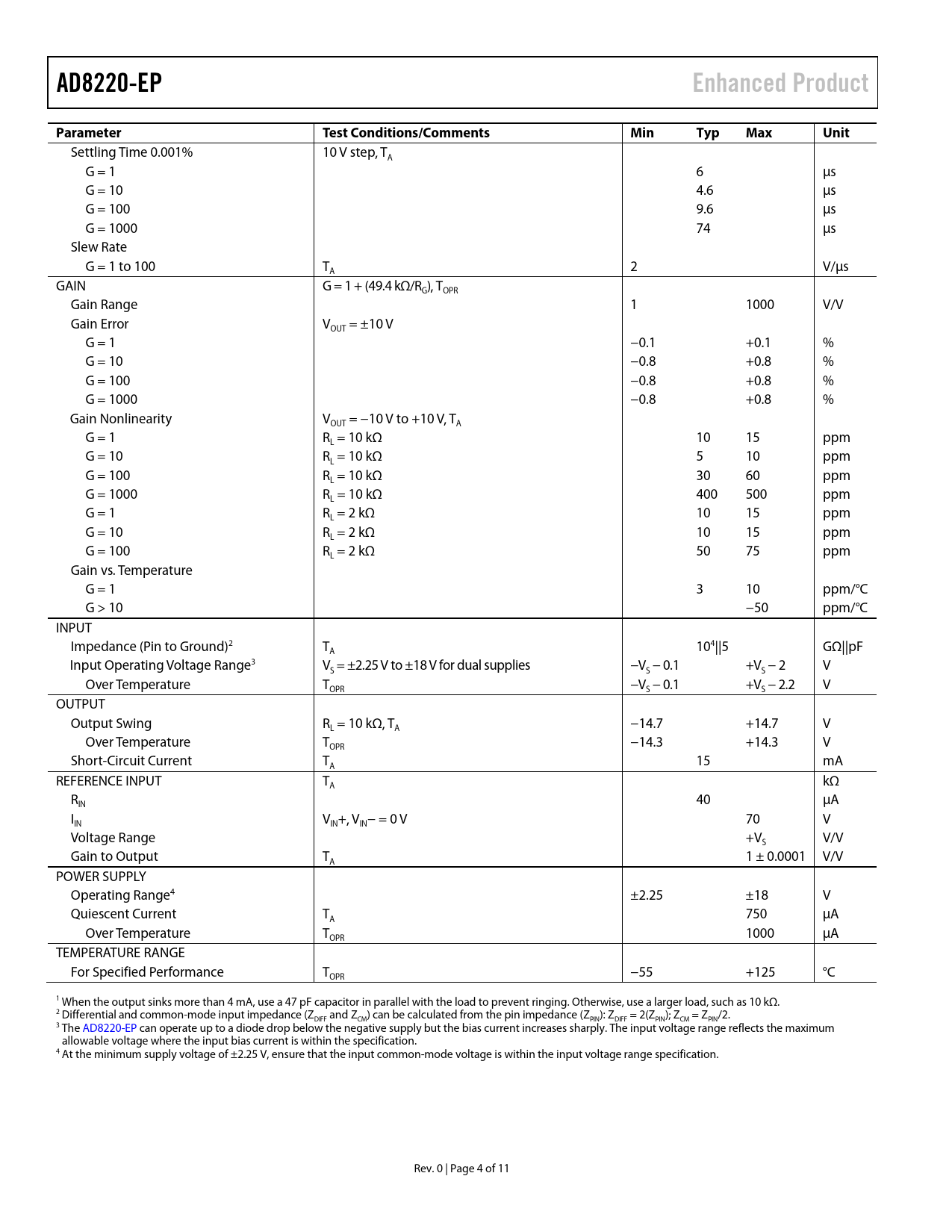 AD8220-EPEnhanced ProductParameterTest Conditions/CommentsMinTypMaxUnit Settling Time 0.001% 10 V step, T A G = 1 6 µs G = 10 4.6 µs G = 100 9.6 µs G = 1000 74 µs Slew Rate G = 1 to 100 T 2 V/µs A GAIN G = 1 + (49.4 kΩ/R ), T G OPR Gain Range 1 1000 V/V Gain Error V = ±10 V OUT G = 1 −0.1 +0.1 % G = 10 −0.8 +0.8 % G = 100 −0.8 +0.8 % G = 1000 −0.8 +0.8 % Gain Nonlinearity V = −10 V to +10 V, T OUT A G = 1 R = 10 kΩ 10 15 ppm L G = 10 R = 10 kΩ 5 10 ppm L G = 100 R = 10 kΩ 30 60 ppm L G = 1000 R = 10 kΩ 400 500 ppm L G = 1 R = 2 kΩ 10 15 ppm L G = 10 R = 2 kΩ 10 15 ppm L G = 100 R = 2 kΩ 50 75 ppm L Gain vs. Temperature G = 1 3 10 ppm/°C G > 10 −50 ppm/°C INPUT Impedance (Pin to Ground)2 T 104||5 GΩ||pF A Input Operating Voltage Range3 V = ±2.25 V to ±18 V for dual supplies −V − 0.1 +V − 2 V S S S Over Temperature T −V − 0.1 +V − 2.2 V OPR S S OUTPUT Output Swing R = 10 kΩ, T −14.7 +14.7 V L A Over Temperature T −14.3 +14.3 V OPR Short-Circuit Current T 15 mA A REFERENCE INPUT T kΩ A R 40 µA IN I V +, V − = 0 V 70 V IN IN IN Voltage Range +V V/V S Gain to Output T 1 ± 0.0001 V/V A POWER SUPPLY Operating Range4 ±2.25 ±18 V Quiescent Current T 750 µA A Over Temperature T 1000 µA OPR TEMPERATURE RANGE For Specified Performance T −55 +125 °C OPR 1 When the output sinks more than 4 mA, use a 47 pF capacitor in parallel with the load to prevent ringing. Otherwise, use a larger load, such as 10 kΩ. 2 Differential and common-mode input impedance (ZDIFF and ZCM) can be calculated from the pin impedance (ZPIN): ZDIFF = 2(ZPIN); ZCM = ZPIN/2. 3 The AD8220-EP can operate up to a diode drop below the negative supply but the bias current increases sharply. The input voltage range reflects the maximum allowable voltage where the input bias current is within the specification. 4 At the minimum supply voltage of ±2.25 V, ensure that the input common-mode voltage is within the input voltage range specification. Rev. 0 | Page 4 of 11 Document Outline FEATURES ENHANCED PRODUCT FEATURES APPLICATIONS GENERAL DESCRIPTION PIN CONFIGURATION TABLE OF CONTENTS REVISION HISTORY SPECIFICATIONS ABSOLUTE MAXIMUM RATINGS ESD CAUTION PIN CONFIGURATION AND FUNCTION DESCRIPTIONS TYPICAL PERFORMANCE CHARACTERISTICS OUTLINE DIMENSIONS ORDERING GUIDE