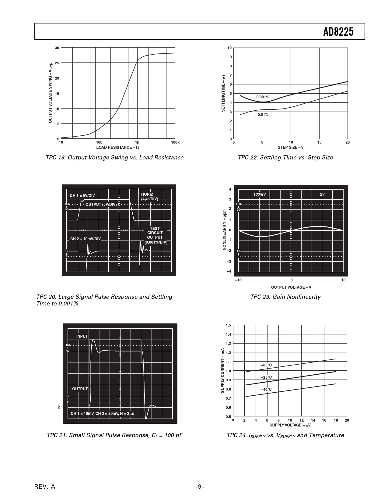 AD8225 30 10 9 25 8 V p-p s 7 20 6 GE SWING – 15 5 A T 0.001% L O 4 V 10 SETTLING TIME 3 0.01% OUTPUT 2 5 1 0 0 10 100 1k 100k 0 5 10 15 20 LOAD RESISTANCE – STEP SIZE – V