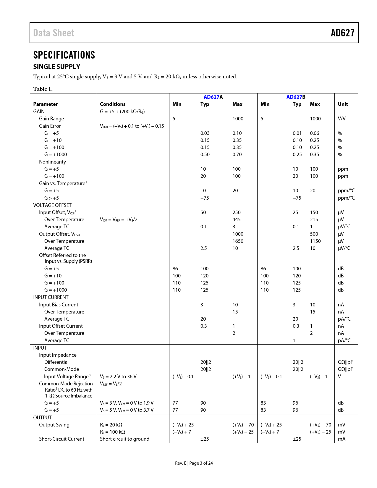 Data Sheet. AD627. SPECIFICATIONS SINGLE SUPPLY. Table 1. AD627A. AD627B. Parameter. Conditions. Min. Typ. Max. Unit