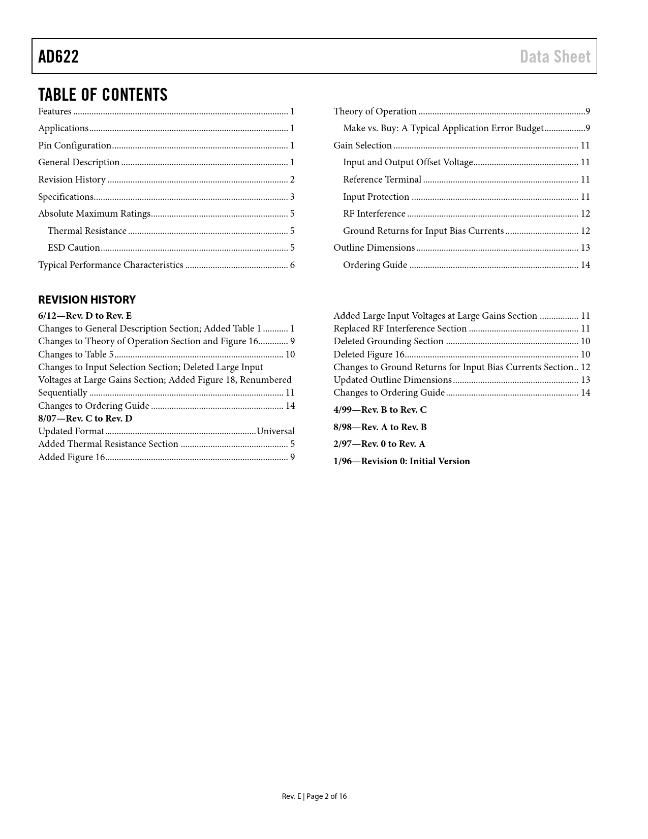 AD622. Data Sheet. TABLE OF CONTENTS. REVISION HISTORY 6/12—Rev. D to Rev. E. 4/99—Rev. B to Rev. C. 8/07—Rev. C to Rev. D