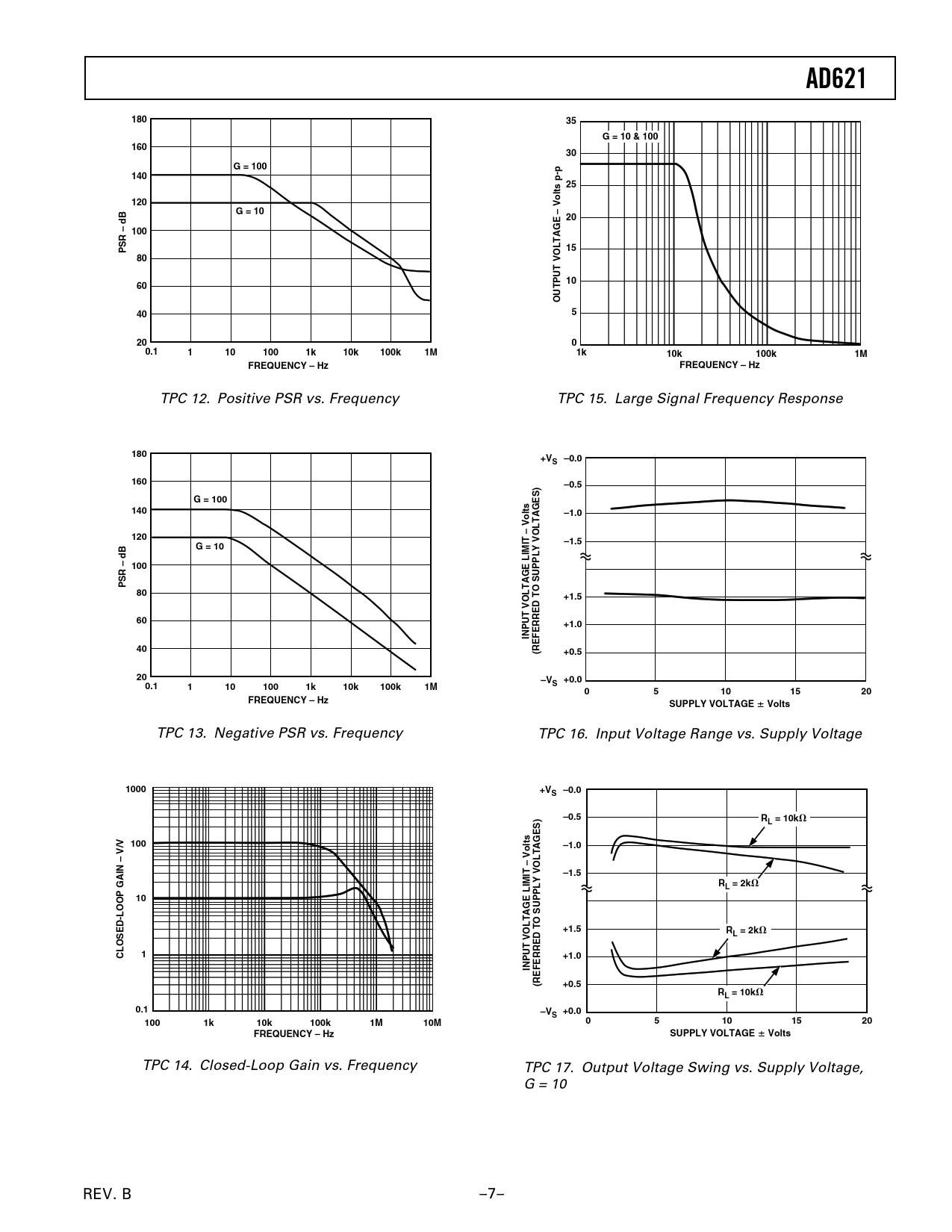 TPC 14. Closed-Loop Gain vs. Frequency TPC 17. Output Voltage Swing vs. Supply Voltage, G = 10 REV. B –7–