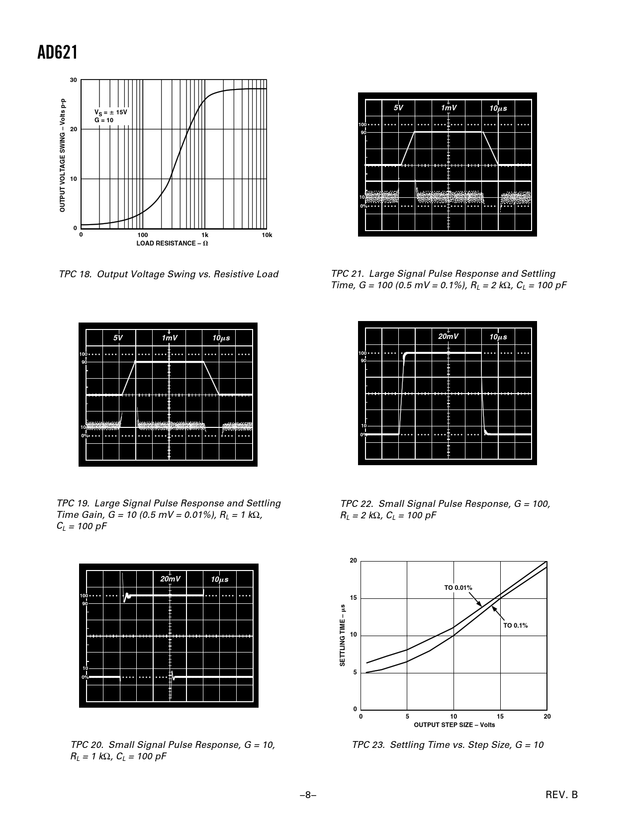 AD621. 1mV. VS =. 15V G = 10. Volts p-p. 100. – 20. OUTPUT VOLTAGE SWING. 10k. LOAD RESISTANCE –. 20mV. TO 0.01%. TO 0.1%. SETTLING TIME