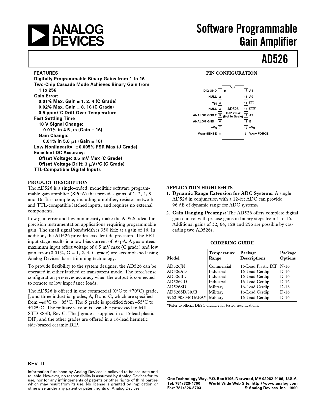 The AD526 offers complete digital Low gain error and low nonlinearity make the AD526 ideal for gain control with precise gains in binary steps from 1 to 16. precision instrumentation applications requiring programmable Additional gains of 32, 64, 128 and 256 are possible by cas- gain. The small signal bandwidth is 350 kHz at a gain of 16. In cading two AD526s