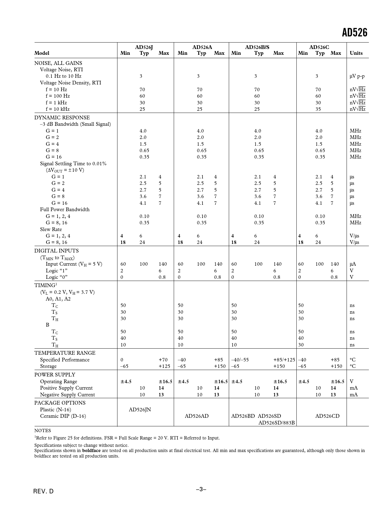 mA PACKAGE OPTIONS Plastic (N-16) AD526JN Ceramic DIP (D-16) AD526AD AD526BD AD526SD AD526CD AD526SD/883B NOTES 1Refer to Figure 25 for definitions. FSR = Full Scale Range = 20 V. RTI = Referred to Input. Specifications subject to change without notice. Specifications shown in