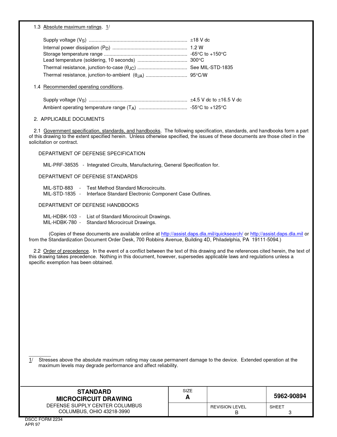 1.3 Absolute maximum ratings. 1/ Supply voltage (VS) ... ±18 V dc Internal power dissipation (PD) .. 1.2 W Storage temperature range .. -65°C to +150°C Lead temperature (soldering, 10 seconds) .. 300°C Thermal resistance, junction-to-case (θJC) .. See MIL-STD-1835 Thermal resistance, junction-to-ambient (θJA) .. 95°C/W 1.4 Recommended operating conditions. Supply voltage (VS) ... ±4.5 V dc to ±16.5 V dc Ambient operating temperature range (TA) ... -55°C to +125°C 2. APPLICABLE DOCUMENTS 2.1 Government specification, standards, and handbooks. The following specification, standards, and handbooks form a part of this drawing to the extent specified herein. Unless otherwise specified, the issues of these documents are those cited in the solicitation or contract. DEPARTMENT OF DEFENSE SPECIFICATION MIL-PRF-38535 - Integrated Circuits, Manufacturing, General Specification for. DEPARTMENT OF DEFENSE STANDARDS MIL-STD-883 - Test Method Standard Microcircuits. MIL-STD-1835 - Interface Standard Electronic Component Case Outlines. DEPARTMENT OF DEFENSE HANDBOOKS MIL-HDBK-103 - List of Standard Microcircuit Drawings. MIL-HDBK-780 - Standard Microcircuit Drawings. (Copies of these documents are available online at http://assist.daps.dla.mil/quicksearch/ or http://assist.daps.dla.mil or from the Standardization Document Order Desk, 700 Robbins Avenue, Building 4D, Philadelphia, PA 19111-5094.) 2.2 Order of precedence. In the event of a conflict between the text of this drawing and the references cited herein, the text of this drawing takes precedence. Nothing in this document, however, supersedes applicable laws and regulations unless a specific exemption has been obtained. ________ 1/ Stresses above the absolute maximum rating may cause permanent damage to the device. Extended operation at the maximum levels may degrade performance and affect reliability. STANDARD SIZE 5962-90894MICROCIRCUIT DRAWINGA DEFENSE SUPPLY CENTER COLUMBUS REVISION LEVEL SHEET COLUMBUS, OHIO 43218-3990 B 3 DSCC FORM 2234 APR 97