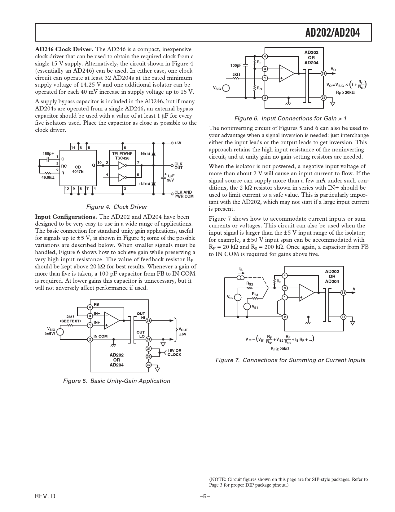 AD202/AD204AD246 Clock Driver. The AD246 is a compact, inexpensive AD202 clock driver that can be used to obtain the required clock from a OR single 15 V supply. Alternatively, the circuit shown in Figure 4 RFAD204100pF (essentially an AD246) can be used. In either case, one clock VO2k circuit can operate at least 32 AD204s at the rated minimum R supply voltage of 14.25 V and one additional isolator can be VF ( ) VO = V SIG1 + –––RSIGRGG operated for each 40 mV increase in supply voltage up to 15 V. RF 20k A supply bypass capacitor is included in the AD246, but if many AD204s are operated from a single AD246, an external bypass capacitor should be used with a value of at least 1 mF for every Figure 6. Input Connections for Gain > 1 five isolators used. Place the capacitor as close as possible to the clock driver. The noninverting circuit of Figures 5 and 6 can also be used to your advantage when a signal inversion is needed: just interchange 15V either the input leads or the output leads to get inversion. This 14656 approach retains the high input resistance of the noninverting 180pFTELEDYNE1N9141 circuit, and at unity gain no gain-setting resistors are needed. CTSC42631027CLKRCQCDOUT When the isolator is not powered, a negative input voltage of 2 R4047B45+ more than about 2 V will cause an input current to flow. If the 49.9k1F35V signal source can supply more than a few mA under such con- 1N91412 98743 ditions, the 2 kW resistor shown in series with IN+ should be CLK AND PWR COM used to limit current to a safe value. This is particularly impor- tant with the AD202, which may not start if a large input current Figure 4. Clock Driver is present. Input Configurations. The AD202 and AD204 have been Figure 7 shows how to accommodate current inputs or sum designed to be very easy to use in a wide range of applications. currents or voltages. This circuit can also be used when the The basic connection for standard unity gain applications, useful input signal is larger than the ± 5 V input range of the isolator; for signals up to ± 5 V, is shown in Figure 5; some of the possible for example, a ± 50 V input span can be accommodated with variations are described below. When smaller signals must be RF = 20 kW and RS = 200 kW. Once again, a capacitor from FB handled, Figure 6 shows how to achieve gain while preserving a to IN COM is required for gains above five. very high input resistance. The value of feedback resistor RF should be kept above 20 kW for best results. Whenever a gain of IS more than five is taken, a 100 pF capacitor from FB to IN COM AD202OR is required. At lower gains this capacitor is unnecessary, but it RFAD204RS2 will not adversely affect performance if used. VRS1VS2FBVS1IN–OUT2kHI(SEE TEXT)IN+VSIGVOUTOUT(5V)5VIN COMLORRV = – ( VFFS1 ––– + V S2 ––– + IS RF + ... ) RS1RS215V ORRF 20kAD202CLOCKOR Figure 7. Connections for Summing or Current Inputs AD204 Figure 5. Basic Unity-Gain Application (NOTE: Circuit figures shown on this page are for SIP-style packages. Refer to Page 3 for proper DIP package pinout.) REV. D –5– Document Outline FEATURES APPLICATIONS GENERAL DESCRIPTION PRODUCT HIGHLIGHTS SPECIFICATIONS AD246–SPECIFICATIONS AD246 Pin Designations PIN DESIGNATIONS ORDERING GUIDE DIFFERENCES BETWEEN THE AD202 AND AD204 INSIDE THE AD202 AND AD204 USING THE AD202 AND AD204 Powering the AD204 AD246 Clock Drive Input Configurations Adjustments Common-Mode Performance Dynamics and Noise Using Isolated Power Operation at Reduced Signal Swing PCB Layout for Multichannel Applications Synchronization APPLICATIONS EXAMPLES Low Level Sensor Inputs Process Current Input with Offset High Compliance Current Source Motor Control Isolator. Floating Current Source/Ohmmeter Photodiode Amplifier OUTLINE DIMENSIONS Revision History
