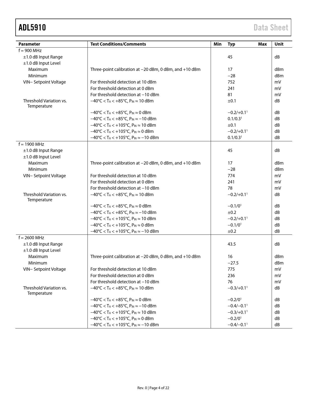link to page 6 link to page 6 link to page 6 ADL5910Data SheetParameterTest Conditions/CommentsMin TypMaxUnit f = 900 MHz ±1.0 dB Input Range 45 dB ±1.0 dB Input Level Maximum Three-point calibration at −20 dBm, 0 dBm, and +10 dBm 17 dBm Minimum −28 dBm VIN− Setpoint Voltage For threshold detection at 10 dBm 752 mV For threshold detection at 0 dBm 241 mV For threshold detection at −10 dBm 81 mV Threshold Variation vs. −40°C < TA < +85°C, PIN ≈ 10 dBm ±0.1 dB Temperature −40°C < TA < +85°C, PIN ≈ 0 dBm −0.2/+0.11 dB −40°C < TA < +85°C, PIN ≈ −10 dBm 0.1/0.31 dB −40°C < TA < +105°C, PIN ≈ 10 dBm ±0.1 dB −40°C < TA < +105°C, PIN ≈ 0 dBm −0.2/+0.11 dB −40°C < TA < +105°C, PIN ≈ −10 dBm 0.1/0.31 dB f = 1900 MHz ±1.0 dB Input Range 45 dB ±1.0 dB Input Level Maximum Three-point calibration at −20 dBm, 0 dBm, and +10 dBm 17 dBm Minimum −28 dBm VIN− Setpoint Voltage For threshold detection at 10 dBm 774 mV For threshold detection at 0 dBm 241 mV For threshold detection at −10 dBm 78 mV Threshold Variation vs. −40°C < TA < +85°C, PIN ≈ 10 dBm −0.2/+0.11 dB Temperature −40°C < TA < +85°C, PIN ≈ 0 dBm −0.1/01 dB −40°C < TA < +85°C, PIN ≈ −10 dBm ±0.2 dB −40°C < TA < +105°C, PIN ≈ 10 dBm −0.2/+0.11 dB −40°C < TA < +105°C, PIN ≈ 0 dBm −0.1/01 dB −40°C < TA < +105°C, PIN ≈ −10 dBm ±0.2 dB f = 2600 MHz ±1.0 dB Input Range 43.5 dB ±1.0 dB Input Level Maximum Three-point calibration at −20 dBm, 0 dBm, and +10 dBm 16 dBm Minimum −27.5 dBm VIN− Setpoint Voltage For threshold detection at 10 dBm 775 mV For threshold detection at 0 dBm 236 mV For threshold detection at −10 dBm 76 mV Threshold Variation vs. −40°C < TA < +85°C, PIN ≈ 10 dBm −0.3/+0.11 dB Temperature −40°C < TA < +85°C, PIN ≈ 0 dBm −0.2/01 dB −40°C < TA < +85°C, PIN ≈ −10 dBm −0.4/−0.11 dB −40°C < TA < +105°C, PIN ≈ 10 dBm −0.3/+0.11 dB −40°C < TA < +105°C, PIN ≈ 0 dBm −0.2/01 dB −40°C < TA < +105°C, PIN ≈ −10 dBm −0.4/−0.11 dB Rev. 0 | Page 4 of 22 Document Outline FEATURES APPLICATIONS FUNCTIONAL BLOCK DIAGRAM GENERAL DESCRIPTION TABLE OF CONTENTS REVISION HISTORY SPECIFICATIONS ABSOLUTE MAXIMUM RATINGS THERMAL RESISTANCE ESD CAUTION PIN CONFIGURATION AND FUNCTION DESCRIPTIONS TYPICAL PERFORMANCE CHARACTERISTICS THEORY OF OPERATION BASIC CONNECTIONS Q AND QB RESPONSE TIME SETTING THE VIN− THRESHOLD DETECTION VOLTAGE APPLICATIONS INFORMATION A COMPLETE INPUT PROTECTION CIRCUIT RESET ON ENABLE OR AT POWER-UP IMPROVING FREQUENCY FLATNESS EVALUATION BOARD OUTLINE DIMENSIONS ORDERING GUIDE