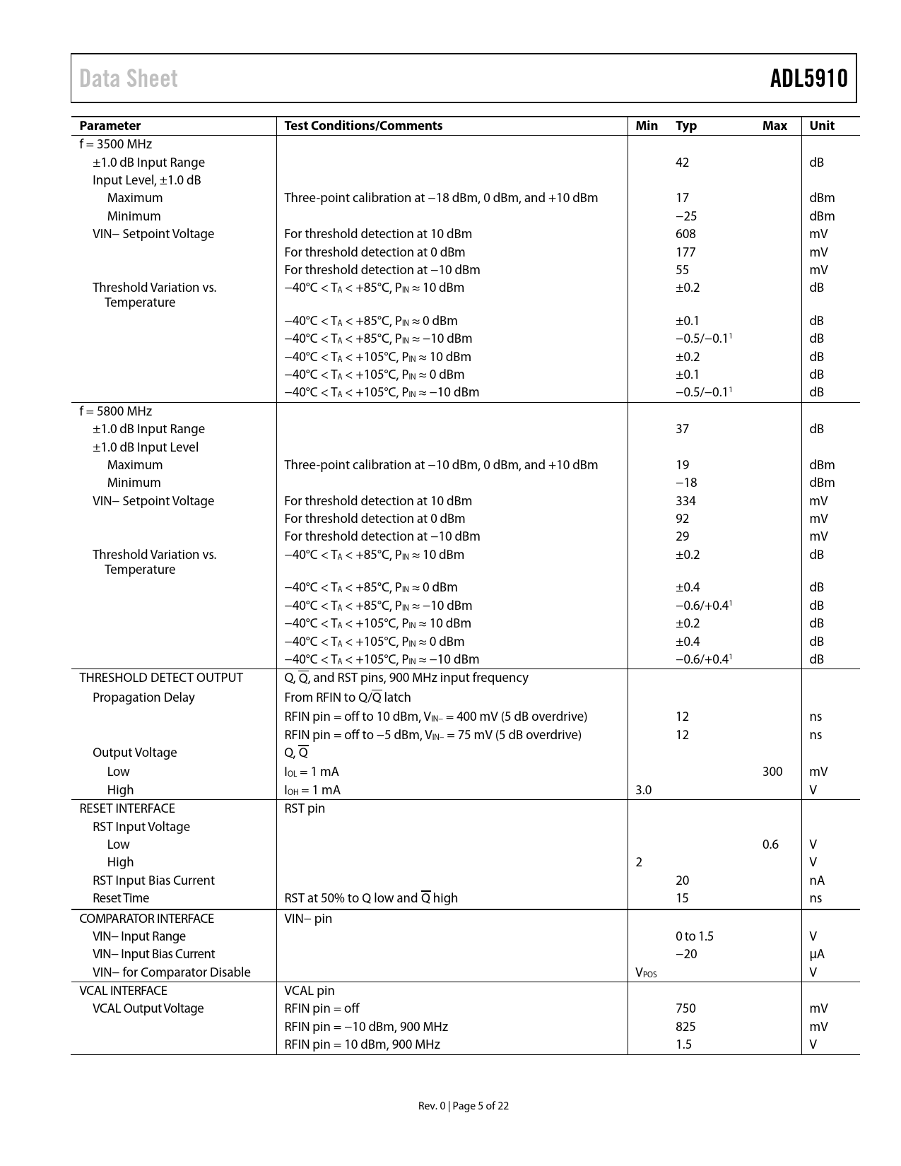Páginas / Página22 / 5 — Data Sheet. ADL5910. Parameter. Test Conditions/Comments. Min Typ. Max. …