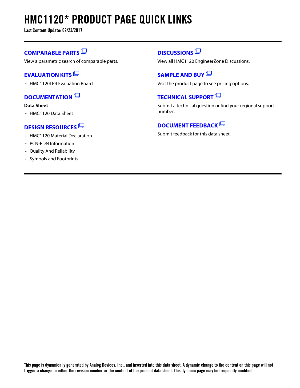 HMC1120* PRODUCT PAGE QUICK LINKS Last Content Update: 02/23/2017COMPARABLE PARTSDISCUSSIONS View a parametric search of comparable parts. View all HMC1120 EngineerZone Discussions. EVALUATION KITSSAMPLE AND BUY • HMC1120LP4 Evaluation Board Visit the product page to see pricing options. DOCUMENTATIONTECHNICAL SUPPORTData Sheet Submit a technical question or find your regional support • HMC1120 Data Sheet number. DESIGN RESOURCESDOCUMENT FEEDBACK • HMC1120 Material Declaration Submit feedback for this data sheet. • PCN-PDN Information • Quality And Reliability • Symbols and Footprints This page is dynamically generated by Analog Devices, Inc., and inserted into this data sheet. A dynamic change to the content on this page will not trigger a change to either the revision number or the content of the product data sheet. This dynamic page may be frequently modified. Document Outline Typical Applications Features Functional Diagram General Description Typical Performance Characteristics Electrical Specifications RMSOUT Error vs. Pin with Different Modulations @ 1900 MHz RMSOUT & Error vs. Pin @ 500 MHz RMSOUT & Error vs. Pin @ 900 MHz RMSOUT & Error vs. Pin @ 1900 MHz RMSOUT & Error vs. Pin @ 2200 MHz RMSOUT & Error vs. Pin @ 2700 MHz RMSOUT & Error vs. Pin @ 3500 MHz RMSOUT Intercept vs. Frequency RMSOUT Slope vs. Frequency RMSOUT vs. Pin with WCDMA 4 Carrier @ +25 °C RMSOUT Error vs. Pin with WCDMA 4 Carrier @ +25 °C RMSOUT Error vs. Pin with WCDMA 4 Carrier @ +85 °C wrt +25 °C Response RMSOUT vs. Pin with CW @ +25 °C RMSOUT Error vs. Pin with CW @ +25 °C RMSOUT vs. Pin w/ CW & WCDMA 4 Carrier @ 1900 MHz & +25 °C Reading Error for WCDMA 4 Carrier wrt CW Response @ +25 °C RMSOUT vs. Pin w/ CW & WCDMA 4 Carrier @ 1900 MHz & +85 °C Reading Error for WCDMA 4 Carrier wrt CW Response @ +85 °C RMSOUT vs. Pin w/ CW & WCDMA 4 Carrier @ 1900 MHz & -40 °C Reading Error for WCDMA 4 Carrier wrt CW Response @ -40 °C RMSOUT Output Response with SCI = 0000 @ 1900 MHz RMSOUT Output Response with SCI = 1100 @ 1900 MHz Typical Supply Current vs. Pin, Vcc = 3.3V Input Return Loss vs. Frequency Output Ripple & Rise/Fall Time vs. Integration Setting [Sci4,Sci3,Sci2,Sci1] in Decimal ETOUT vs. Vin with CW @ 900 MHz ETOUT & ETOUT Error vs. Pin with CW @ 900 MHz ETOUT vs. Vin with CW @ 1900 MHz ETOUT & ETOUT Error vs. Pin with CW @ 1900 MHz ETOUT vs. Pin with CW @ 2200 MHz ETOUT & ETOUT Error vs. Pin with CW @ 2200 MHz ETOUT vs. Pin with CW @ 2700 MHz ETOUT & ETOUT Error vs. Pin with CW @ 2700 MHz ETOUT vs. Pin with CW @ 3500 MHz ETOUT & ETOUT Error vs. Pin with CW @ 3500 MHz ETOUT & ETOUT Error vs. Pin with CW @ 3900 MHz ETOUT vs. Pin with CW @ 3900 MHz ETOUT Intercept vs. Frequency with CW ETOUT Slope vs. Frequency with CW Absolute Maximum Ratings Outline Drawing Package Information Pin Descriptions Evaluation PCB Evaluation Order Information List of Materials for Evaluation PCB Application Circuit Application Information Principle of Operation Configuration For The Typical Application Broadband Single-Ended Input Interface Envelope Detector Output RMS Output Interface and Transient Response LOG-Slope and Intercept DC Offset Compensation Loop Standby Mode Modulation Performance - Crest factor performance System Calibration Layout Considerations Definitions