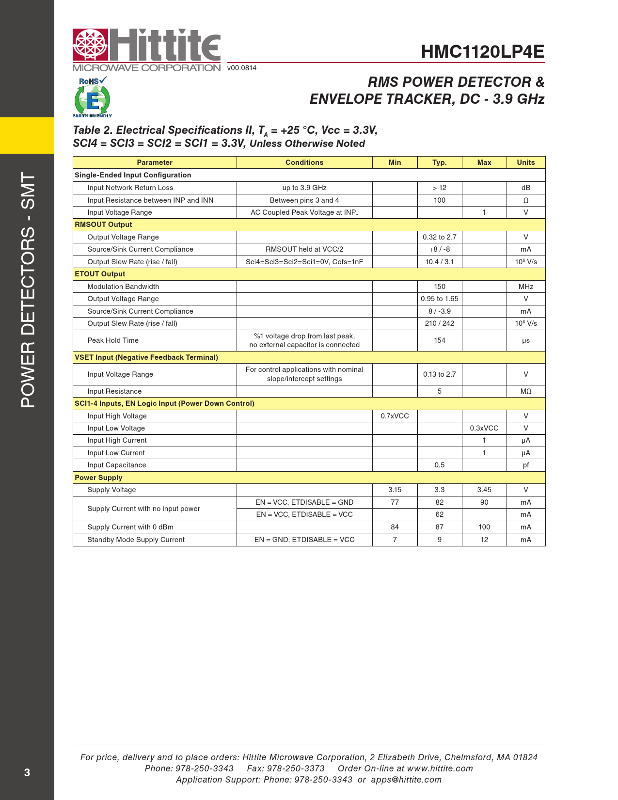 Application Support: Phone: 978-250-3343 or apps@hittite.com Document Outline Typical Applications Features Functional Diagram General Description Typical Performance Characteristics Electrical Specifications RMSOUT Error vs. Pin with Different Modulations @ 1900 MHz RMSOUT & Error vs. Pin @ 500 MHz RMSOUT & Error vs. Pin @ 900 MHz RMSOUT & Error vs. Pin @ 1900 MHz RMSOUT & Error vs. Pin @ 2200 MHz RMSOUT & Error vs. Pin @ 2700 MHz RMSOUT & Error vs. Pin @ 3500 MHz RMSOUT Intercept vs. Frequency RMSOUT Slope vs. Frequency RMSOUT vs. Pin with WCDMA 4 Carrier @ +25 °C RMSOUT Error vs. Pin with WCDMA 4 Carrier @ +25 °C RMSOUT Error vs. Pin with WCDMA 4 Carrier @ +85 °C wrt +25 °C Response RMSOUT vs. Pin with CW @ +25 °C RMSOUT Error vs. Pin with CW @ +25 °C RMSOUT vs. Pin w/ CW & WCDMA 4 Carrier @ 1900 MHz & +25 °C Reading Error for WCDMA 4 Carrier wrt CW Response @ +25 °C RMSOUT vs. Pin w/ CW & WCDMA 4 Carrier @ 1900 MHz & +85 °C Reading Error for WCDMA 4 Carrier wrt CW Response @ +85 °C RMSOUT vs. Pin w/ CW & WCDMA 4 Carrier @ 1900 MHz & -40 °C Reading Error for WCDMA 4 Carrier wrt CW Response @ -40 °C RMSOUT Output Response with SCI = 0000 @ 1900 MHz RMSOUT Output Response with SCI = 1100 @ 1900 MHz Typical Supply Current vs. Pin, Vcc = 3.3V Input Return Loss vs. Frequency Output Ripple & Rise/Fall Time vs. Integration Setting [Sci4,Sci3,Sci2,Sci1] in Decimal ETOUT vs. Vin with CW @ 900 MHz ETOUT & ETOUT Error vs. Pin with CW @ 900 MHz ETOUT vs. Vin with CW @ 1900 MHz ETOUT & ETOUT Error vs. Pin with CW @ 1900 MHz ETOUT vs. Pin with CW @ 2200 MHz ETOUT & ETOUT Error vs. Pin with CW @ 2200 MHz ETOUT vs. Pin with CW @ 2700 MHz ETOUT & ETOUT Error vs. Pin with CW @ 2700 MHz ETOUT vs. Pin with CW @ 3500 MHz ETOUT & ETOUT Error vs. Pin with CW @ 3500 MHz ETOUT & ETOUT Error vs. Pin with CW @ 3900 MHz ETOUT vs. Pin with CW @ 3900 MHz ETOUT Intercept vs. Frequency with CW ETOUT Slope vs. Frequency with CW Absolute Maximum Ratings Outline Drawing Package Information Pin Descriptions Evaluation PCB Evaluation Order Information List of Materials for Evaluation PCB Application Circuit Application Information Principle of Operation Configuration For The Typical Application Broadband Single-Ended Input Interface Envelope Detector Output RMS Output Interface and Transient Response LOG-Slope and Intercept DC Offset Compensation Loop Standby Mode Modulation Performance - Crest factor performance System Calibration Layout Considerations Definitions