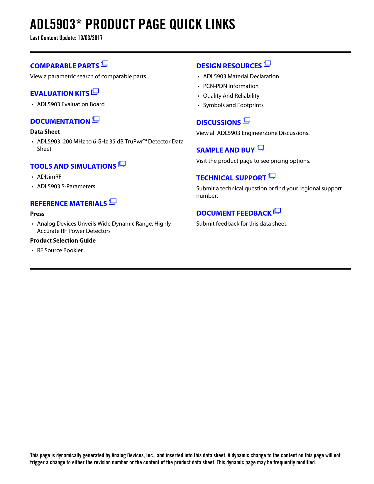 ADL5903* PRODUCT PAGE QUICK LINKS Last Content Update: 10/03/2017COMPARABLE PARTSDESIGN RESOURCES View a parametric search of comparable parts. • ADL5903 Material Declaration • PCN-PDN Information EVALUATION KITS • Quality And Reliability • ADL5903 Evaluation Board • Symbols and Footprints DOCUMENTATIONDISCUSSIONSData Sheet View all ADL5903 EngineerZone Discussions. • ADL5903: 200 MHz to 6 GHz 35 dB TruPwr™ Detector Data Sheet SAMPLE AND BUY Visit the product page to see pricing options. TOOLS AND SIMULATIONS • ADIsimRF TECHNICAL SUPPORT • ADL5903 S-Parameters Submit a technical question or find your regional support number. REFERENCE MATERIALSPressDOCUMENT FEEDBACK • Analog Devices Unveils Wide Dynamic Range, Highly Submit feedback for this data sheet. Accurate RF Power Detectors Product Selection Guide • RF Source Booklet This page is dynamically generated by Analog Devices, Inc., and inserted into this data sheet. A dynamic change to the content on this page will not trigger a change to either the revision number or the content of the product data sheet. This dynamic page may be frequently modified. Document Outline FEATURES APPLICATIONS FUNCTIONAL BLOCK DIAGRAM GENERAL DESCRIPTION TABLE OF CONTENTS REVISION HISTORY SPECIFICATIONS ABSOLUTE MAXIMUM RATINGS ESD CAUTION PIN CONFIGURATION AND FUNCTION DESCRIPTIONS TYPICAL PERFORMANCE CHARACTERISTICS MEASUREMENT SETUPS THEORY OF OPERATION RF INPUT INTERFACE BASIC CONNECTIONS CHOOSING A VALUE FOR CRMS DEVICE CALIBRATION AND ERROR CALCULATION EVALUATION BOARD SCHEMATIC AND CONFIGURATION OPTIONS OUTLINE DIMENSIONS ORDERING GUIDE