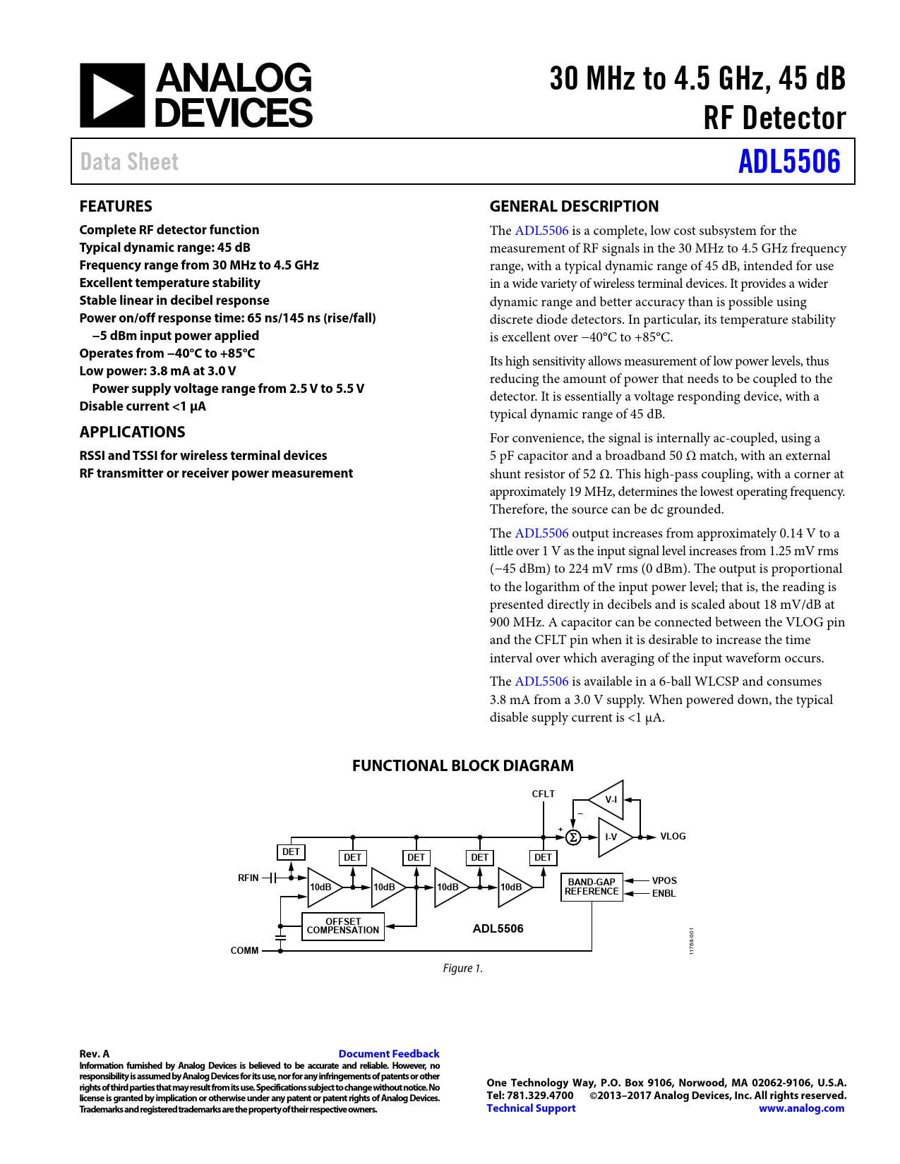 30 MHz to 4.5 GHz, 45 dB. RF Detector. Data Sheet. ADL5506. FEATURES. GENERAL DESCRIPTION. Complete RF detector function