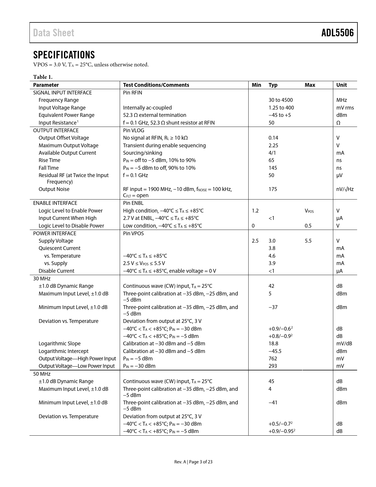 Data Sheet. ADL5506. SPECIFICATIONS. Table 1. Parameter. Test Conditions/Comments. Min Typ. Max. Unit