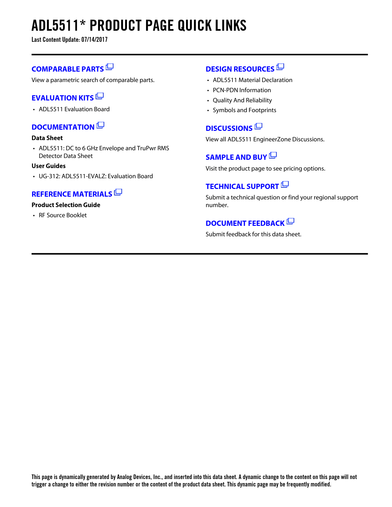ADL5511* PRODUCT PAGE QUICK LINKS Last Content Update: 07/14/2017COMPARABLE PARTSDESIGN RESOURCES View a parametric search of comparable parts. • ADL5511 Material Declaration • PCN-PDN Information EVALUATION KITS • Quality And Reliability • ADL5511 Evaluation Board • Symbols and Footprints DOCUMENTATIONDISCUSSIONSData Sheet View all ADL5511 EngineerZone Discussions. • ADL5511: DC to 6 GHz Envelope and TruPwr RMS Detector Data Sheet SAMPLE AND BUYUser Guides Visit the product page to see pricing options. • UG-312: ADL5511-EVALZ: Evaluation Board TECHNICAL SUPPORTREFERENCE MATERIALS Submit a technical question or find your regional support Product Selection Guide number. • RF Source Booklet DOCUMENT FEEDBACK Submit feedback for this data sheet. This page is dynamically generated by Analog Devices, Inc., and inserted into this data sheet. A dynamic change to the content on this page will not trigger a change to either the revision number or the content of the product data sheet. This dynamic page may be frequently modified. Document Outline FEATURES APPLICATIONS FUNCTIONAL BLOCK DIAGRAM GENERAL DESCRIPTION REVISION HISTORY SPECIFICATIONS ABSOLUTE MAXIMUM RATINGS ESD CAUTION PIN CONFIGURATION AND FUNCTION DESCRIPTIONS TYPICAL PERFORMANCE CHARACTERISTICS CIRCUIT DESCRIPTION ENVELOPE PROPAGATION DELAY RMS CIRCUIT DESCRIPTION RMS FILTERING OUTPUT DRIVE CAPABILITY AND BUFFERING Viewing the Envelope on an Oscilloscope APPLICATIONS INFORMATION BASIC CONNECTIONS OPERATION BELOW 1 GHZ/ENVELOPE FILTERING CHOOSING A VALUE FOR THE RMS AVERAGING CAPACITOR (CFLT4) ENVELOPE TRACKING ACCURACY TIME DOMAIN ENVELOPE TRACKING ACCURACY VRMS AND VENV OUTPUT OFFSET DEVICE CALIBRATION AND ERROR CALCULATION ERROR VS. FREQUENCY EVALUATION BOARD OUTLINE DIMENSIONS ORDERING GUIDE