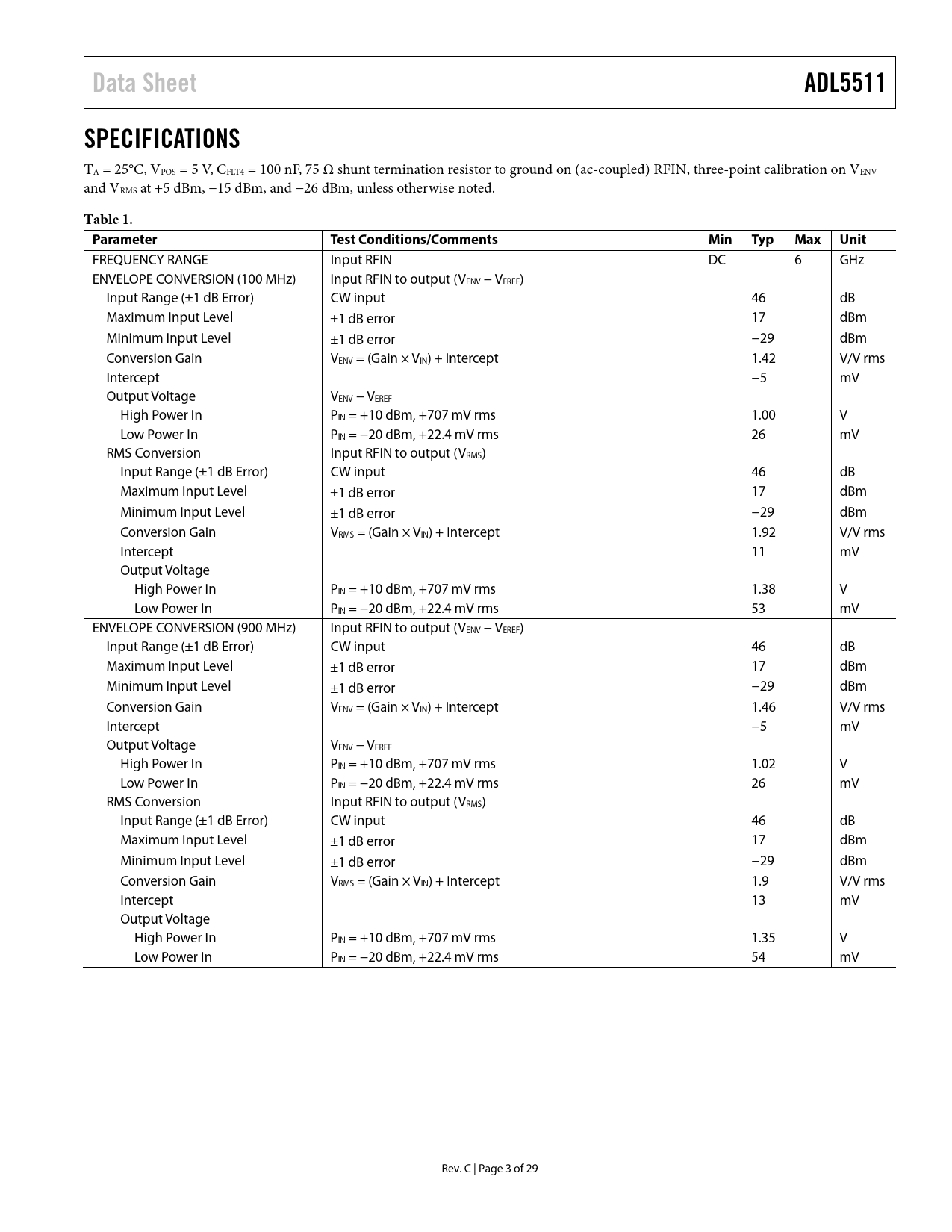 Data Sheet ADL5511 SPECIFICATIONS Table 1 Parameter Test Conditions/Comments Min Typ Max Unit
