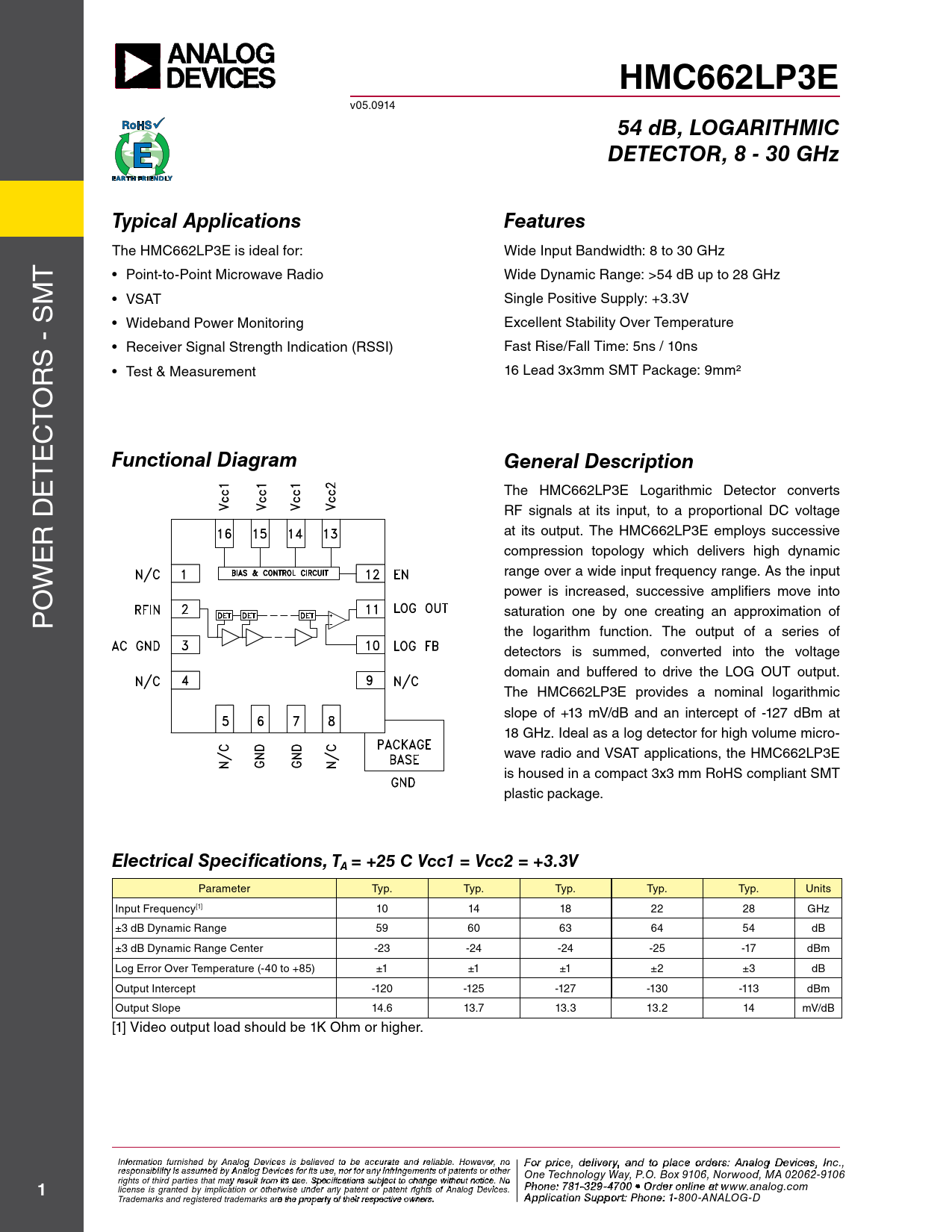HMC662LP3E. 54 dB, LOGARITHMIC. DETECTOR, 8 - 30 GHz. Typical Applications. Features. Functional Diagram. General Description