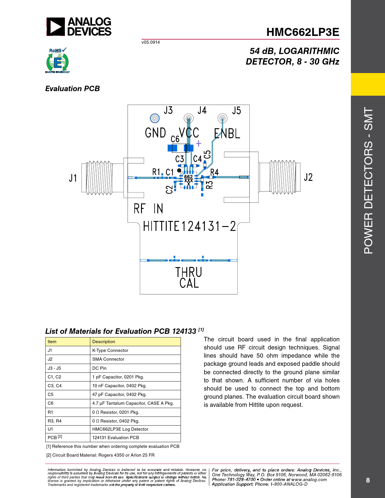 HMC662LP3E. 54 dB, LOGARITHMIC. DETECTOR, 8 - 30 GHz. Evaluation PCB. List of Materials for Evaluation PCB 124133 [1]