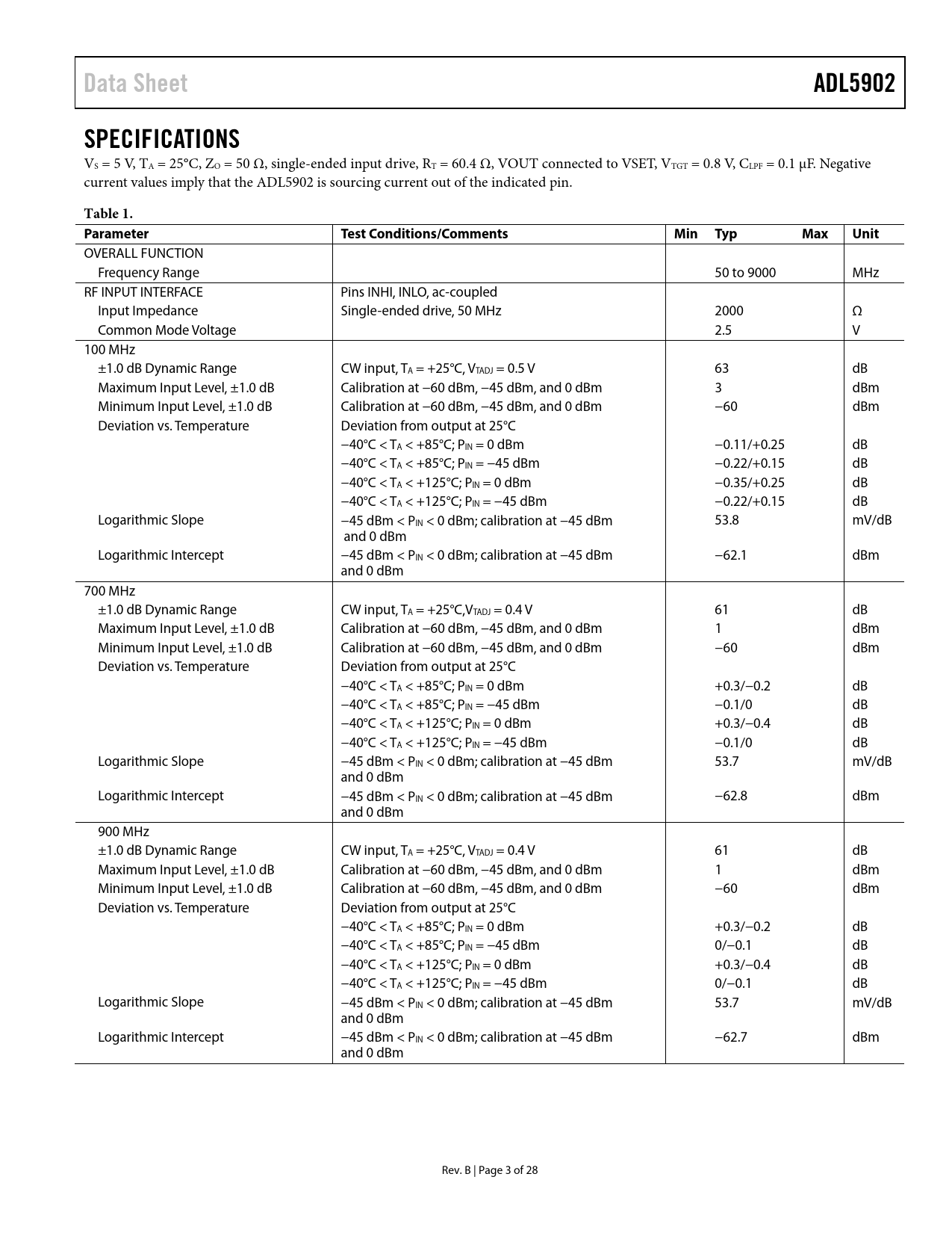 Data Sheet. ADL5902. SPECIFICATIONS. Table 1. Parameter Test. Conditions/Comments. Min. Typ. Max. Unit
