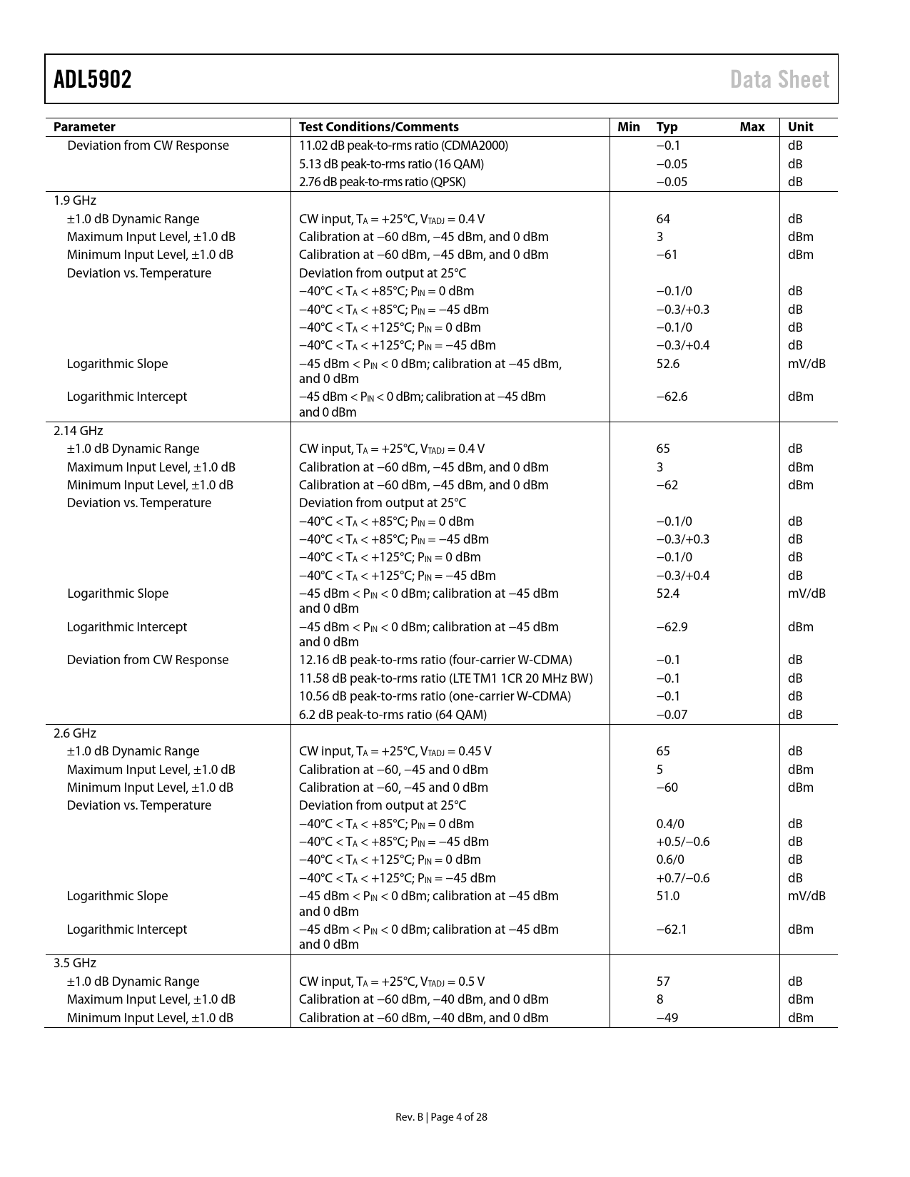 ADL5902. Data Sheet. Parameter Test. Conditions/Comments. Min. Typ. Max. Unit
