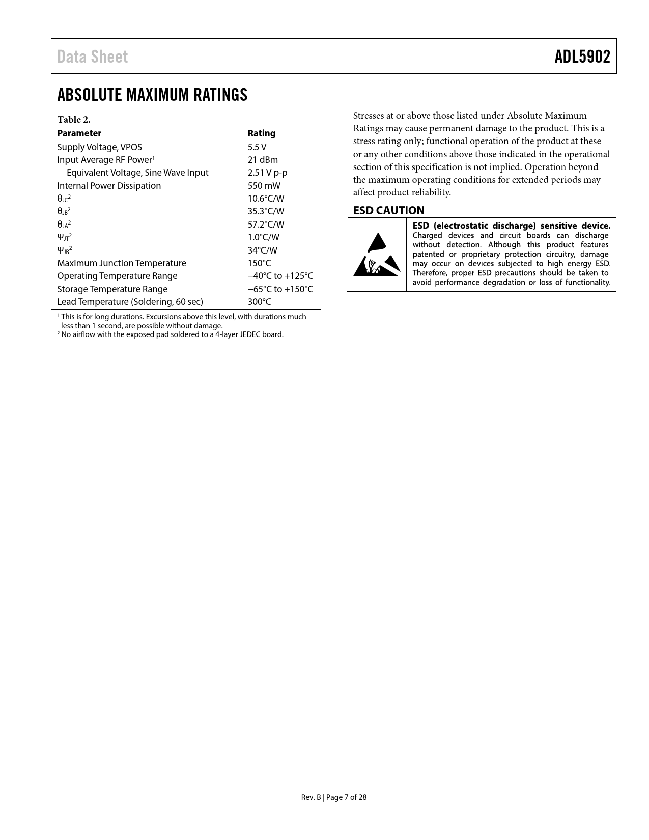 Data Sheet ADL5902 ABSOLUTE MAXIMUM RATINGS Table 2 Parameter Rating ESD CAUTION