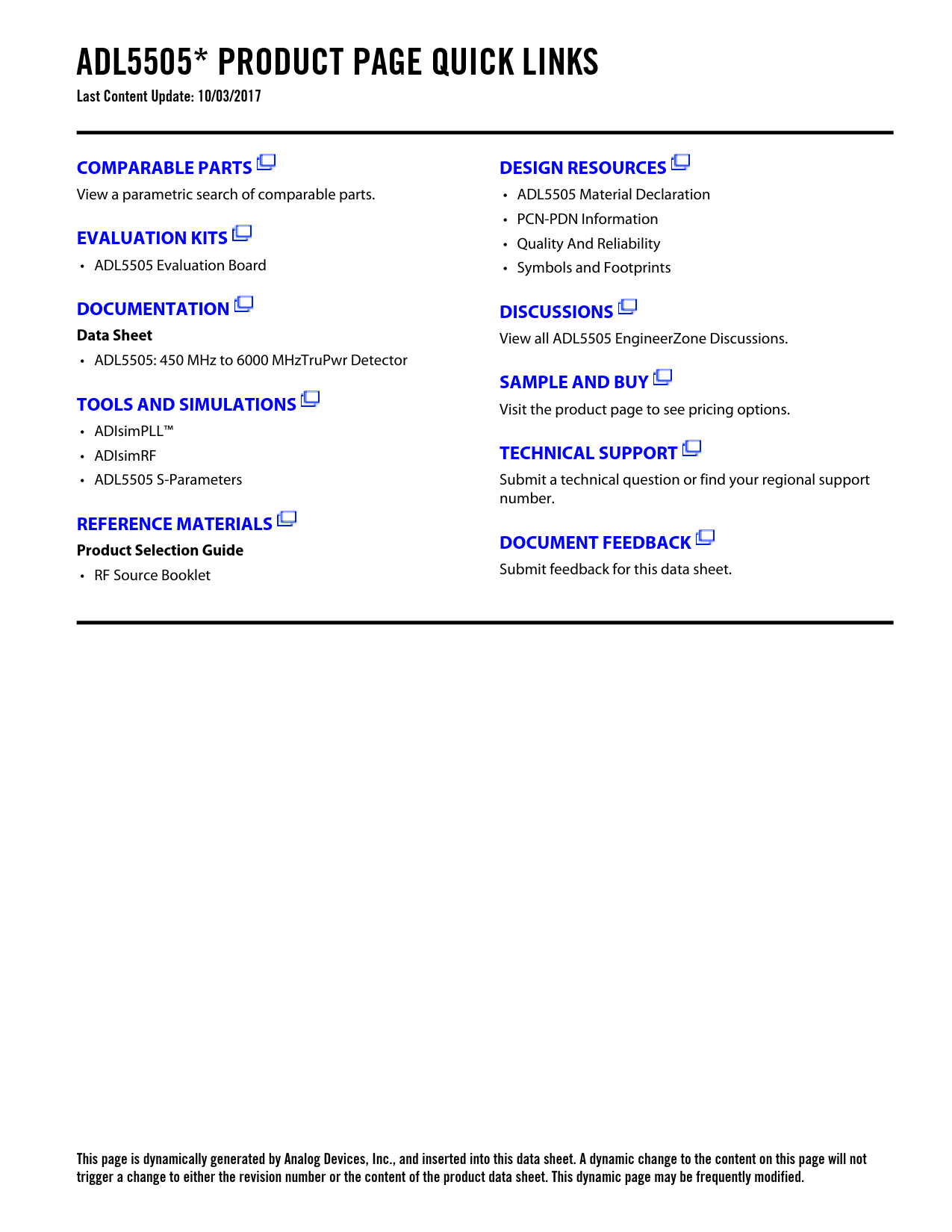ADL5505* PRODUCT PAGE QUICK LINKS Last Content Update: 10/03/2017. COMPARABLE PARTS. DESIGN RESOURCES. EVALUATION KITS