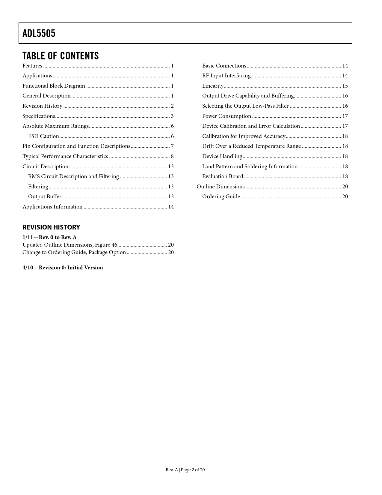 Páginas / Página22 / 4 — ADL5505. TABLE OF CONTENTS. REVISION HISTORY 1/11—Rev. 0 to Rev. A. …