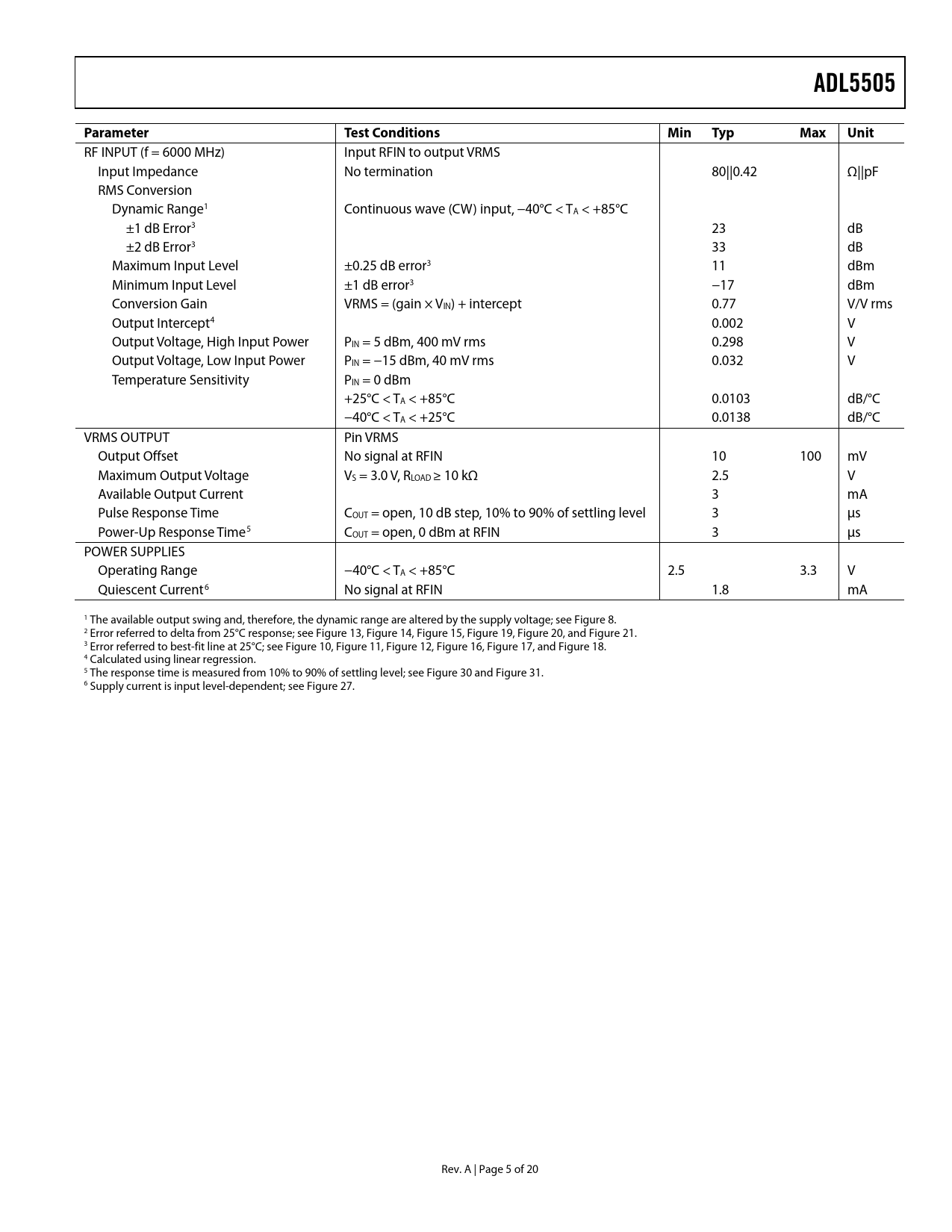 ADL5505 Parameter Test Conditions Min Typ Max Unit