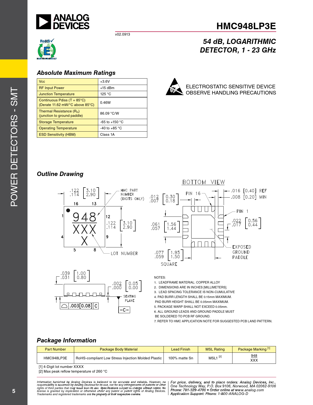 HMC948LP3E. 54 dB, LOGARITHMIC. DETECTOR, 1 - 23 GHz. Absolute Maximum Ratings. Outline Drawing. Package Information