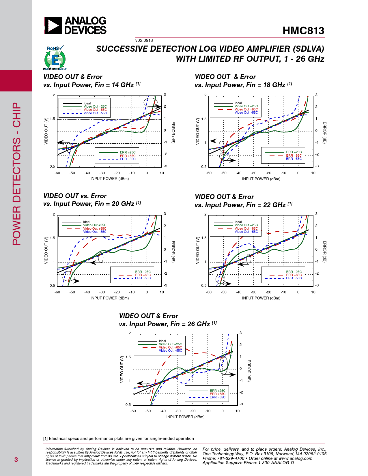HMC813 v02.0913 SUCCESSIVE DETECTION LOG VIDEO AMPLIFIER (SDLVA)WITH LIMITED RF OUTPUT, 1 - 26 GHzVIDEO OUT & ErrorVIDEO OUT & Errorvs. Input Power, Fin = 14 GHz [1]vs. Input Power, Fin = 18 GHz [1] 2 3 2 3 IP Ideal Ideal Video Out +25C 2 Video Out +25C 2 Video Out +85C Video Out +85C H Video Out -55C Video Out -55C 1.5 1 1.5 1 C (V) ERROR (V) ERROR - OUT 0 OUT 0 (dB) (dB) -1 RS VIDEO 1 VIDEO 1 -1 O ERR +25C -2 ERR +25C ERR +85C -2 ERR +85C T ERR -55C ERR -55C C 0.5 -3 0.5 -3 -60 -50 -40 -30 -20 -10 0 10 -60 -50 -40 -30 -20 -10 0 10 TE INPUT POWER (dBm) INPUT POWER (dBm) E D VIDEO OUT vs. ErrorVIDEO OUT & Error R vs. Input Power, Fin = 20 GHz [1]vs. Input Power, Fin = 22 GHz [1] 2 3 2 3 WE Ideal Ideal Video Out +25C 2 Video Out +25C 2 Video Out +85C Video Out +85C O Video Out -55C Video Out -55C P 1.5 1 1.5 1 (V) ERROR (V) ERROR OUT 0 OUT 0 (dB) (dB) VIDEO 1 -1 VIDEO 1 -1 ERR +25C -2 ERR +25C ERR +85C -2 ERR +85C ERR -55C ERR -55C 0.5 -3 0.5 -3 -60 -50 -40 -30 -20 -10 0 10 -60 -50 -40 -30 -20 -10 0 10 INPUT POWER (dBm) INPUT POWER (dBm) VIDEO OUT & Error vs. Input Power, Fin = 26 GHz [1] 2 3 Ideal Video Out +25C 2 Video Out +85C Video Out -55C 1.5 1 (V) ERROR OUT 0 (dB) VIDEO 1 -1 ERR +25C -2 ERR +85C ERR -55C 0.5 -3 -60 -50 -40 -30 -20 -10 0 10 INPUT POWER (dBm) [1] Electrical specs and performance plots are given for single-ended operation I F nf o or r p mati r o in cfe ur , d nish e e l d iv b e y r A y a nalo n g d t Devi o p ces i la s c bele o ieve rd d t e o rbs e : H acc iutrtatite e M and ic reli rao bl w e. a H v o e C wever o , nrp o For price, delivery, and to place orders: Analog Devices, Inc., responsibility is assumed by Analog Devices for its use, nor for any infringements of patents or other oration, 2 Elizabeth Drive, Chelmsford, MA 01824 One Technology Way, P.O. Box 9106, Norwood, MA 02062-9106 Phone: 978-250-3343 Fax: 978-250-3373 O rights of third parties that may result from its use. Specifications subject to change without notice. No rd Phoe n r O e: 7 n- 81-li 3 n 2 e a 9-4 t w 70 ww 0 • O . rdh e itt r o it nle i . n co e a m 3 license is granted by implication or otherwise under any patent or patent rights of Analog Devices. t www.analog.com Application Support: Phon Trademarks and registered trademarks are the property of their respective owners. e: 978-250-334 A 3 p o plic ra a tio pp n S s u @ p h por ittti : Pte ho.c n om e: 1-800-ANALOG-D