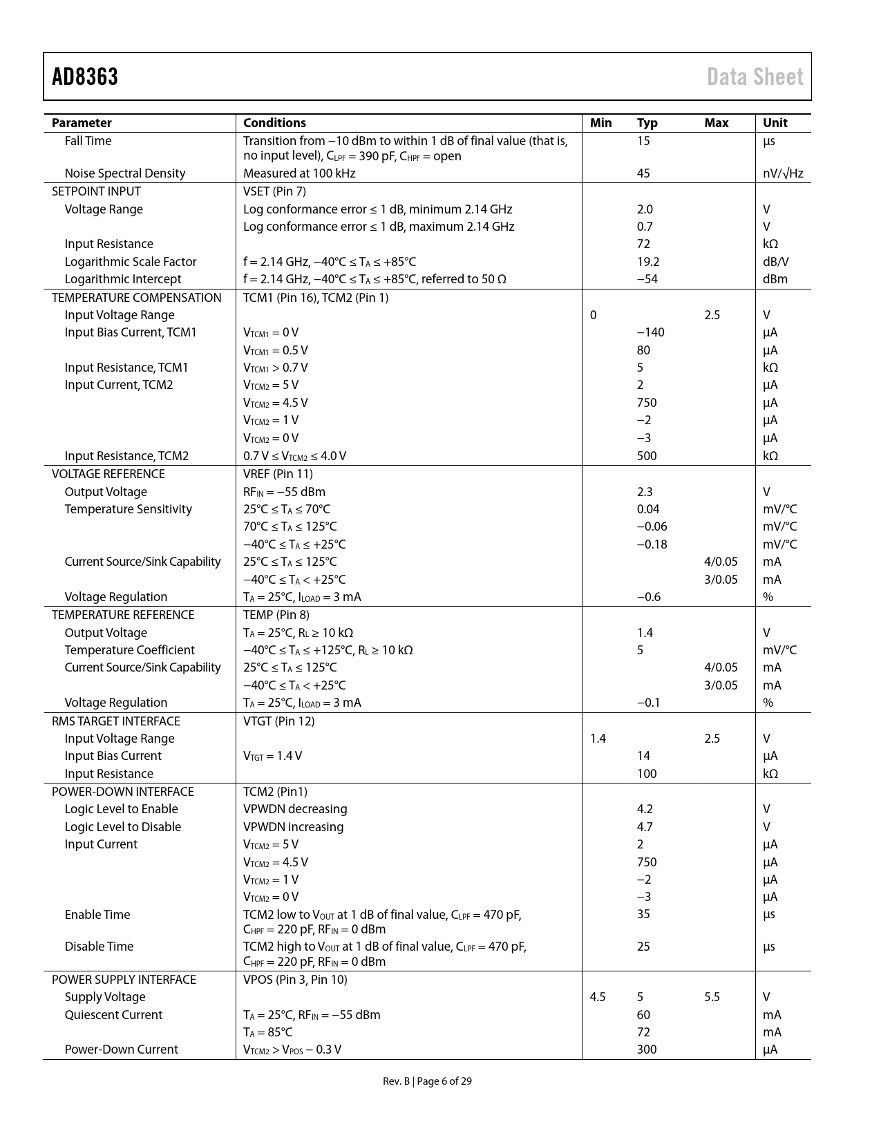 Páginas / Página30 / 7 — AD8363. Data Sheet. Parameter. Conditions. Min. Typ. Max. Unit
