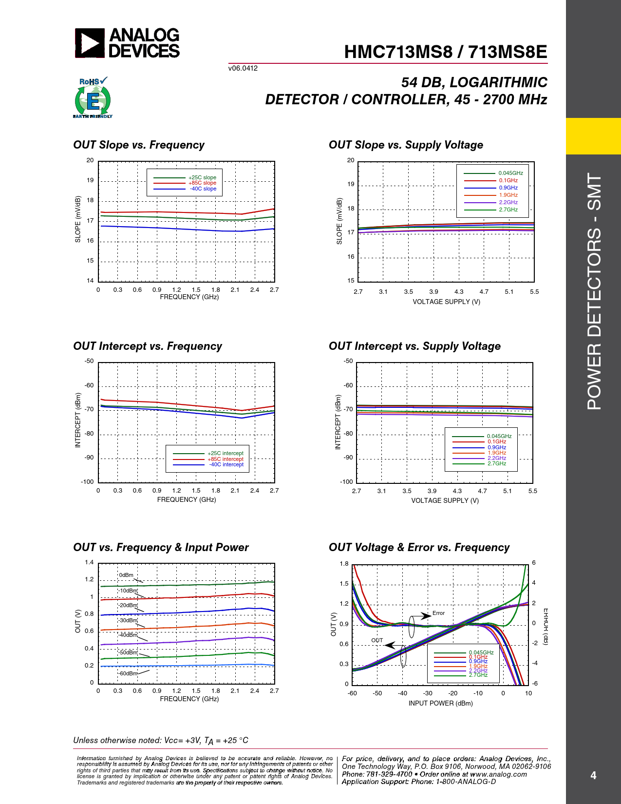 HMC713MS8 / 713MS8E. 54 DB, LOGARITHMIC. DETECTOR / CONTROLLER, 45 - 2700 MHz. OUT Slope vs. Frequency