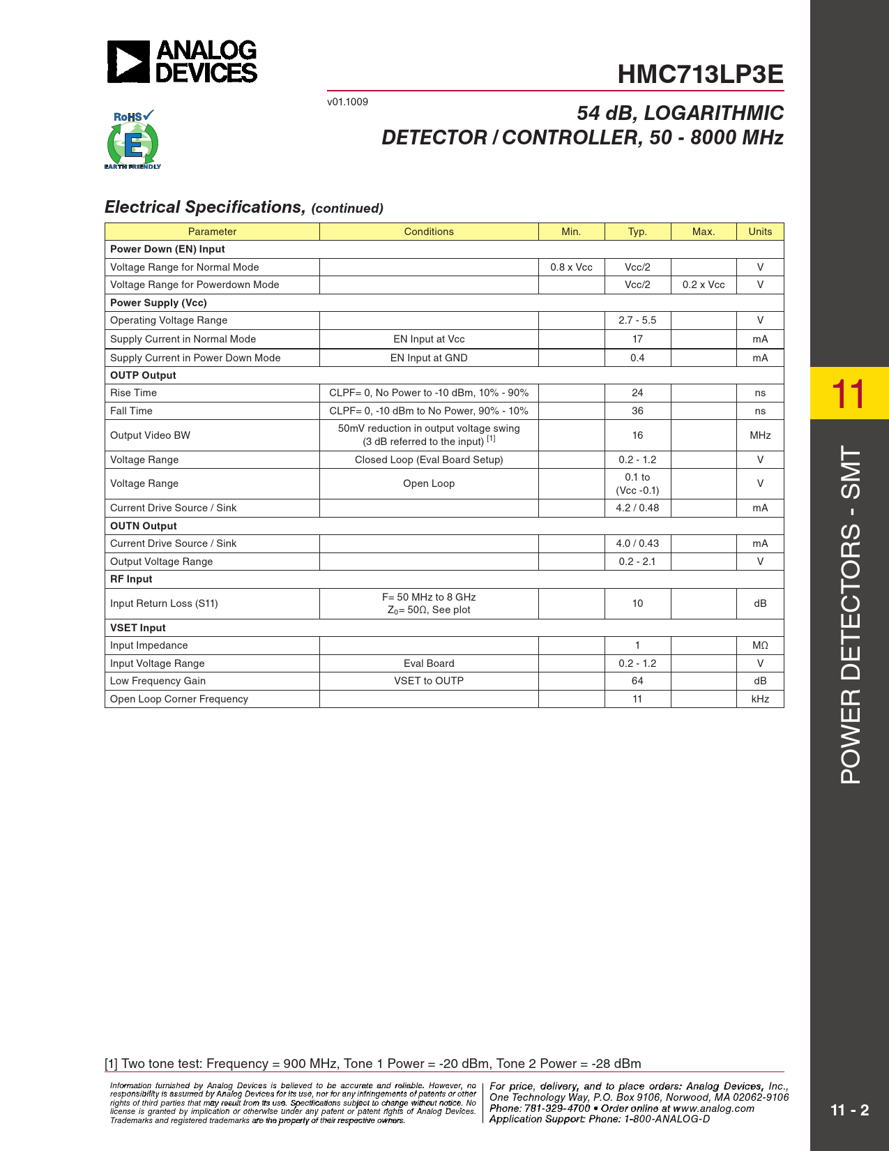HMC713LP3E. 54 dB, LOGARITHMIC. DETECTOR / CONTROLLER, 50 - 8000 MHz. Electrical Specifications, (continued)