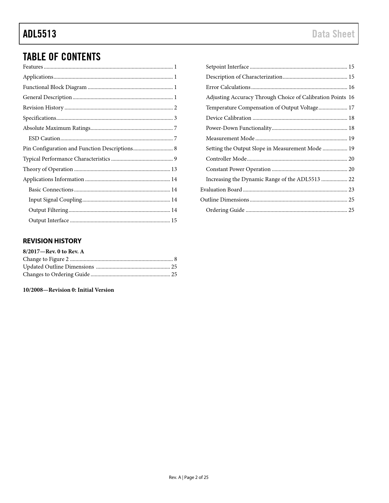 Rev. A | Page 2 of 25 Document Outline Features Applications Functional Block Diagram General Description Table of Contents Revision History Specifications Absolute Maximum Ratings ESD Caution Pin Configuration and Function Descriptions Typical Performance Characteristics Theory of Operation Applications Information Basic Connections Input Signal Coupling Output Filtering Output Interface Setpoint Interface Description of Characterization Error Calculations Adjusting Accuracy Through Choice of Calibration Points Temperature Compensation of Output Voltage Device Calibration Power-Down Functionality Measurement Mode Setting the Output Slope in Measurement Mode Controller Mode Constant Power Operation Increasing the Dynamic Range of the ADL5513 Evaluation Board Outline Dimensions Ordering Guide