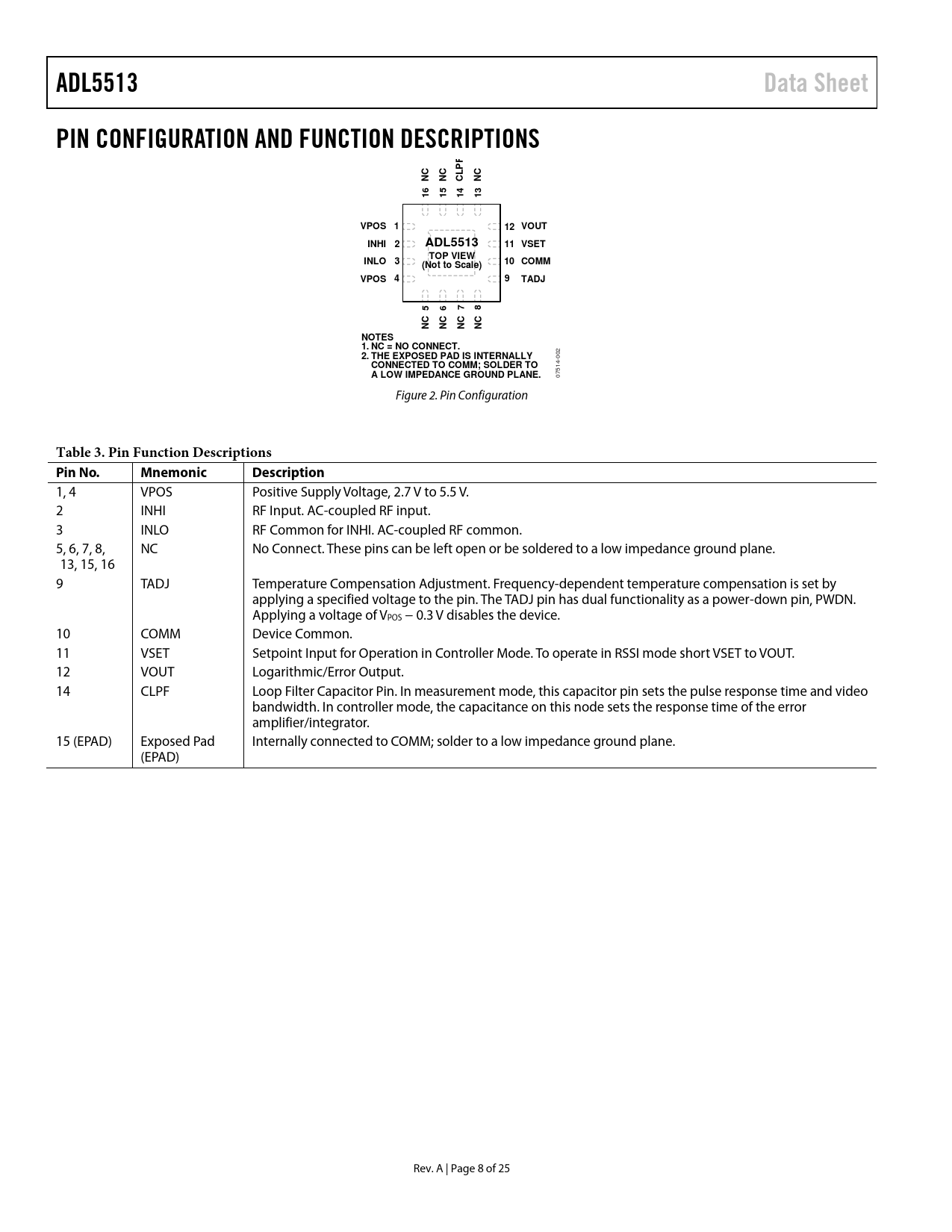 1, 4 VPOS Positive Supply Voltage, 2.7 V to 5.5 V. 2 INHI RF Input. AC-coupled RF input. 3 INLO RF Common for INHI. AC-coupled RF common. 5, 6, 7, 8, NC No Connect. These pins can be left open or be soldered to a low impedance ground plane. 13, 15, 16 9 TADJ Temperature Compensation Adjustment. Frequency-dependent temperature compensation is set by applying a specified voltage to the pin. The TADJ pin has dual functionality as a power-down pin, PWDN. Applying a voltage of VPOS − 0.3 V disables the device. 10 COMM Device Common. 11 VSET Setpoint Input for Operation in Controller Mode. To operate in RSSI mode short VSET to VOUT. 12 VOUT Logarithmic/Error Output. 14 CLPF Loop Filter Capacitor Pin. In measurement mode, this capacitor pin sets the pulse response time and video bandwidth. In controller mode, the capacitance on this node sets the response time of the error amplifier/integrator. 15 (EPAD) Exposed Pad Internally connected to COMM; solder to a low impedance ground plane. (EPAD) Rev. A | Page 8 of 25 Document Outline Features Applications Functional Block Diagram General Description Table of Contents Revision History Specifications Absolute Maximum Ratings ESD Caution Pin Configuration and Function Descriptions Typical Performance Characteristics Theory of Operation Applications Information Basic Connections Input Signal Coupling Output Filtering Output Interface Setpoint Interface Description of Characterization Error Calculations Adjusting Accuracy Through Choice of Calibration Points Temperature Compensation of Output Voltage Device Calibration Power-Down Functionality Measurement Mode Setting the Output Slope in Measurement Mode Controller Mode Constant Power Operation Increasing the Dynamic Range of the ADL5513 Evaluation Board Outline Dimensions Ordering Guide