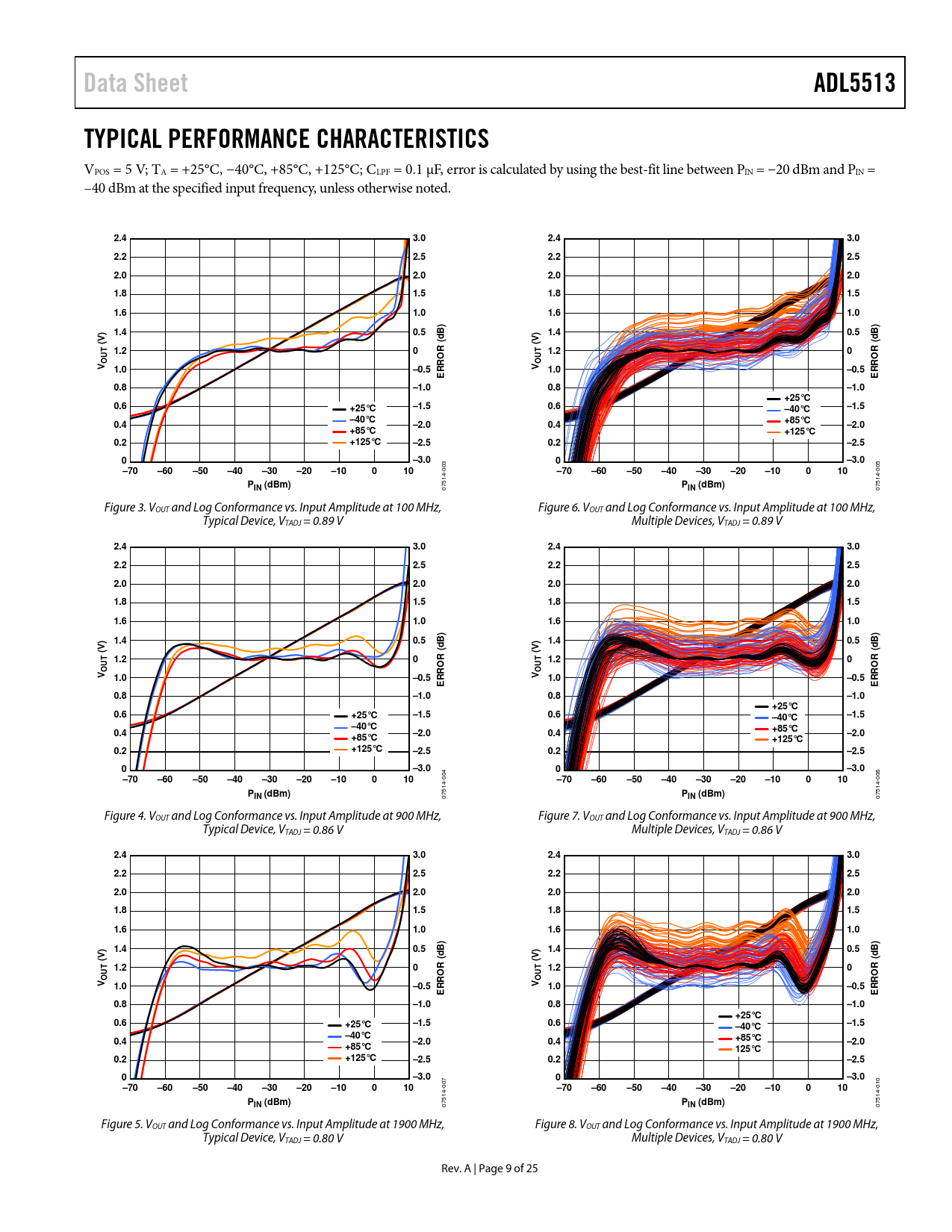 07514- Figure 3. VOUT and Log Conformance vs. Input Amplitude at 100 MHz, Figure 6. VOUT and Log Conformance vs. Input Amplitude at 100 MHz, Typical Device, VTADJ = 0.89 V Multiple Devices, VTADJ = 0.89 V