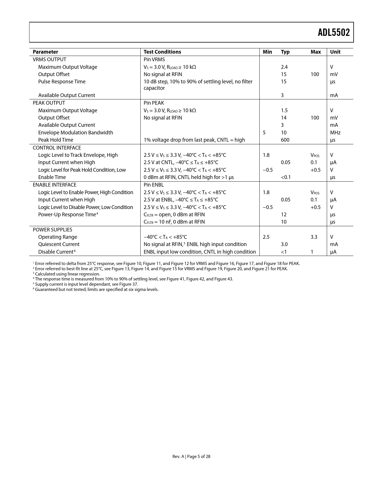 link to page 7 link to page 7 link to page 7 link to page 11 link to page 11 link to page 12 link to page 12 link to page 16 link to page 15 ADL5502Parameter TestConditionsMinTypMaxUnit VRMS OUTPUT Pin VRMS Maximum Output Voltage VS = 3.0 V, RLOAD ≥ 10 kΩ 2.4 V Output Offset No signal at RFIN 15 100 mV Pulse Response Time 10 dB step, 10% to 90% of settling level, no filter 15 μs capacitor Available Output Current 3 mA PEAK OUTPUT Pin PEAK Maximum Output Voltage VS = 3.0 V, RLOAD ≥ 10 kΩ 1.5 V Output Offset No signal at RFIN 14 100 mV Available Output Current 3 mA Envelope Modulation Bandwidth 5 10 MHz Peak Hold Time 1% voltage drop from last peak, CNTL = high 600 μs CONTROL INTERFACE Logic Level to Track Envelope, High 2.5 V ≤ VS ≤ 3.3 V, −40°C < TA < +85°C 1.8 VPOS V Input Current when High 2.5 V at CNTL, –40°C ≤ TA ≤ +85°C 0.05 0.1 μA Logic Level for Peak Hold Condition, Low 2.5 V ≤ VS ≤ 3.3 V, −40°C < TA < +85°C −0.5 +0.5 V Enable Time 0 dBm at RFIN, CNTL held high for >1 μs <0.1 μs ENABLE INTERFACE Pin ENBL Logic Level to Enable Power, High Condition 2.5 V ≤ VS ≤ 3.3 V, −40°C < TA < +85°C 1.8 VPOS V Input Current when High 2.5 V at ENBL, –40°C ≤ TA ≤ +85°C 0.05 0.1 μA Logic Level to Disable Power, Low Condition 2.5 V ≤ VS ≤ 3.3 V, −40°C < TA < +85°C −0.5 +0.5 V Power-Up Response Time4 CFLTR = open, 0 dBm at RFIN 12 μs CFLTR = 10 nF, 0 dBm at RFIN 10 μs POWER SUPPLIES Operating Range −40°C < TA < +85°C 2.5 3.3 V Quiescent Current No signal at RFIN,5 ENBL high input condition 3.0 mA Disable Current6 ENBL input low condition, CNTL in high condition <1 1 μA 1 Error referred to delta from 25°C response, see Figure 10, Figure 11, and Figure 12 for VRMS and Figure 16, Figure 17, and Figure 18 for PEAK. 2 Error referred to best-fit line at 25°C, see Figure 13, Figure 14, and Figure 15 for VRMS and Figure 19, Figure 20, and Figure 21 for PEAK. 3 Calculated using linear regression. 4 The response time is measured from 10% to 90% of settling level, see Figure 41, Figure 42, and Figure 43. 5 Supply current is input level dependant, see Figure 37. 6 Guaranteed but not tested; limits are specified at six sigma levels. Rev. A | Page 5 of 28 Document Outline FEATURES APPLICATIONS GENERAL DESCRIPTION FUNCTIONAL BLOCK DIAGRAM TABLE OF CONTENTS REVISION HISTORY SPECIFICATIONS ABSOLUTE MAXIMUM RATINGS ESD CAUTION PIN CONFIGURATION AND FUNCTION DESCRIPTIONS TYPICAL PERFORMANCE CHARACTERISTICS CIRCUIT DESCRIPTION RMS CIRCUIT DESCRIPTION AND FILTERING FILTERING ENVELOPE PEAK-HOLD CIRCUIT OUTPUT BUFFERS MEASURING THE CREST FACTOR APPLICATIONS INFORMATION BASIC CONNECTIONS RF INPUT INTERFACING Resistive Tap RF Input Multiple RF Inputs LINEARITY Output Swing VRMS Output Offset OUTPUT DRIVE CAPABILITY AND BUFFERING SELECTING THE SQUARE-DOMAIN FILTER AND OUTPUT LOW-PASS FILTER POWER CONSUMPTION, ENABLE, AND POWER-ON/POWER-OFF RESPONSE TIME DEVICE CALIBRATION AND ERROR CALCULATION CALIBRATION FOR IMPROVED ACCURACY CALCULATION OF CREST FACTOR (CF) DRIFT OVER A REDUCED TEMPERATURE RANGE OPERATION AT HIGH FREQUENCIES DEVICE HANDLING EVALUATION BOARD Operating in Peak-Hold Mode Land Pattern and Soldering Information OUTLINE DIMENSIONS ORDERING GUIDE