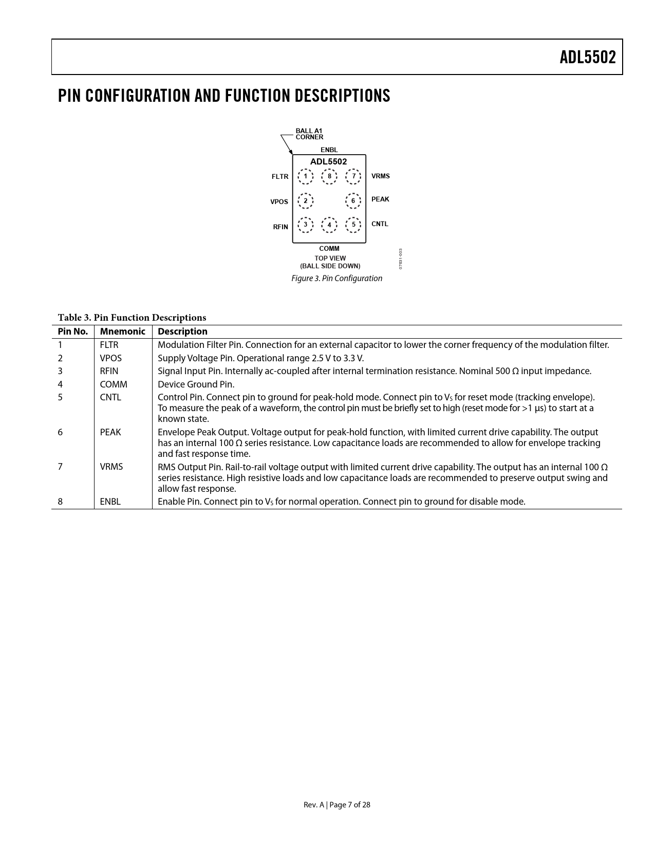 ADL5502. PIN CONFIGURATION AND FUNCTION DESCRIPTIONS. BALL A1. CORNER. ENBL. FLTR. VRMS. VPOS. PEAK. RFIN. CNTL. COMM. TOP VIEW. (BALL SIDE DOWN)