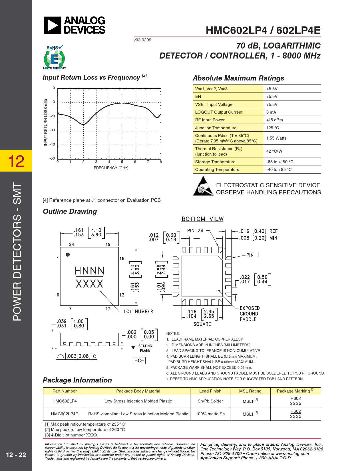 7. REFER TO HMC APPLICATION NOTE FOR SUGGESTED PCB LAND PATTERN. Part Number Package Body Material Lead Finish MSL Rating Package Marking [3] [1] H602 HMC602LP4 Low Stress Injection Molded Plastic Sn/Pb Solder MSL1 XXXX [2] H602 HMC602LP4E RoHS-compliant Low Stress Injection Molded Plastic 100% matte Sn MSL1 XXXX [1] Max peak refl ow temperature of 235 °C [2] Max peak refl ow temperature of 260 °C [3] 4-Digit lot number XXXX Information furnis F heod r pri by An ce, de alog Devi lcievs eir s y b , a eliev nd to pla ed to be accu ce o rate anrder d relia sbl, pl e. H ease co owever, no For price, delivery, and to place orders: Analog Devices, Inc., responsibility is assumed by Analog Devices for its use, nor for any infringements of patents or other ntact Hittite Microwave Corporation: One Technology Way, P.O. Box 9106, Norwood, MA 02062-9106 20 Alpha Road, Chelmsford, MA 01824 Phone: 978 rights of third parties that may result from its use. Specifications subject to change without notice. No Ph - o 25 ne 0 : 7 -3 81- 3 3 4 29 3 F -470 ax: 978 0 • Orde - r o 25 nlin 0- e a3 t 373