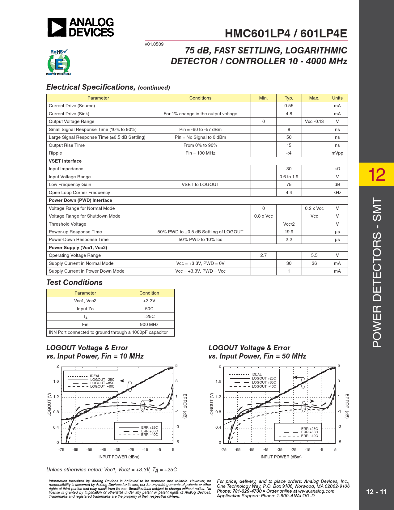 HMC601LP4 / 601LP4E. 75 dB, FAST SETTLING, LOGARITHMIC. DETECTOR / CONTROLLER 10 - 4000 MHz