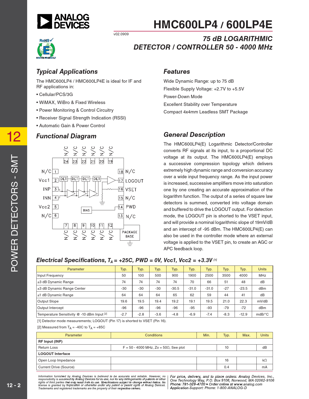 HMC600LP4 / 600LP4E. 75 dB LOGARITHMIC. DETECTOR / CONTROLLER 50 - 4000 MHz. Typical Applications. Features. General Description