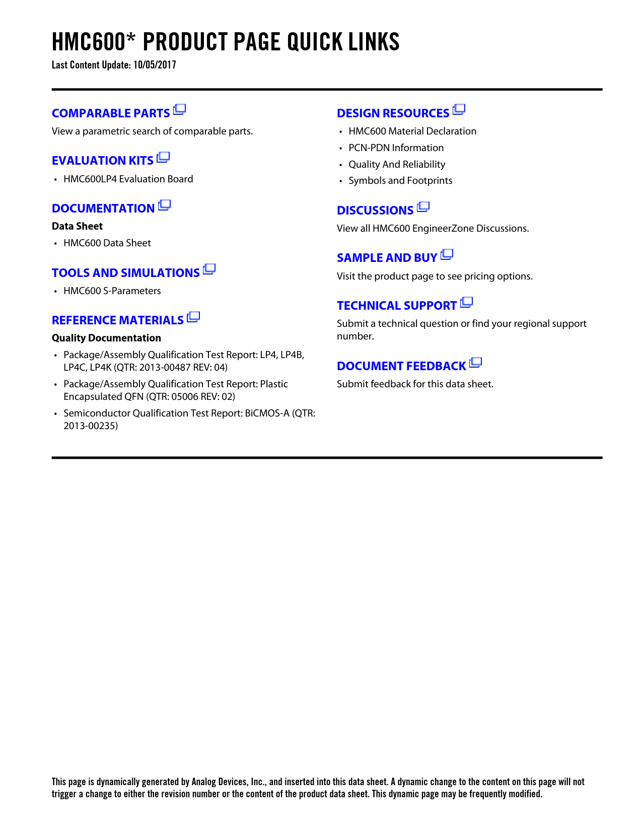 HMC600* PRODUCT PAGE QUICK LINKS Last Content Update: 10/05/2017 COMPARABLE PARTS DESIGN RESOURCES